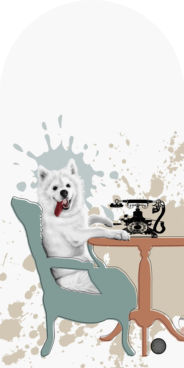 Tematyczna propozycja grafiki z motywem wesołego psa w kolorach pastelowych z układem słów w odniesieniu do biura lub recepcji. Idealne przeznaczenie odnajdzie przy recepcjach weterynaryjnych. Artystyczna tapeta ścienna PREMIUM z motywem graficznym – na rolki.
