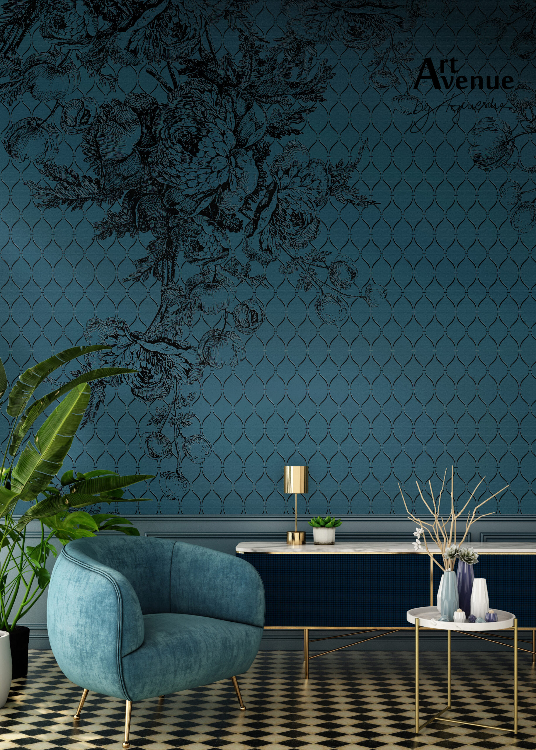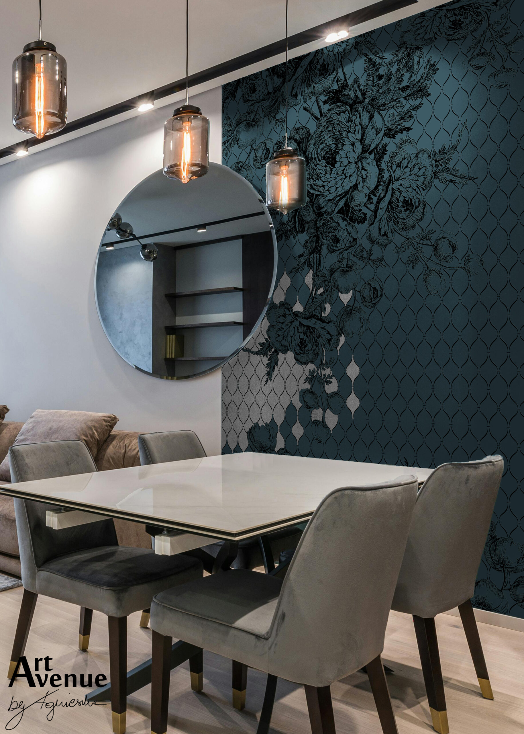 Eleganckie połączenie kwiatowej grafiki z ciekawą mozaiką na tle ciemnego turkusu z miejscowo dodanym efektem imitującym srebro. Stanowi wyjątkowe zestawienie kilku trendów z pięknym wzorem. Artystyczna tapeta ścienna PREMIUM z motywem graficznym – na wymiar.
