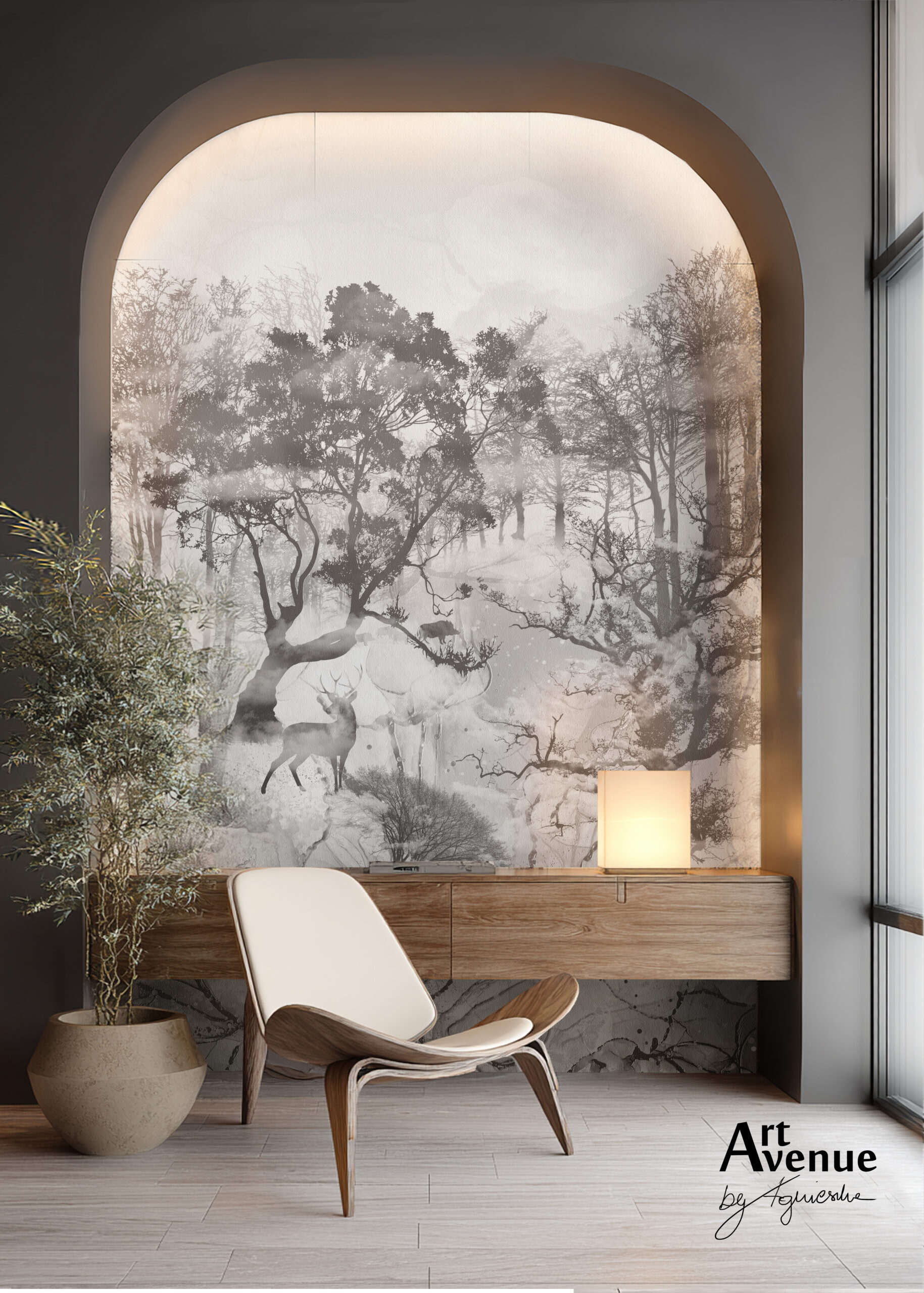 To monochromatyczna propozycja lasu we mgle o mistycznym klimacie z perspektywicznym rysunkiem pięknych gatunków drzew i leśnej fauny. Linearnie ujęta rzeźba terenu z dozą abstrakcji przedstawia wzgórza, wody i doliny. Artystyczna tapeta ścienna PREMIUM z motywem graficznym – na wymiar.