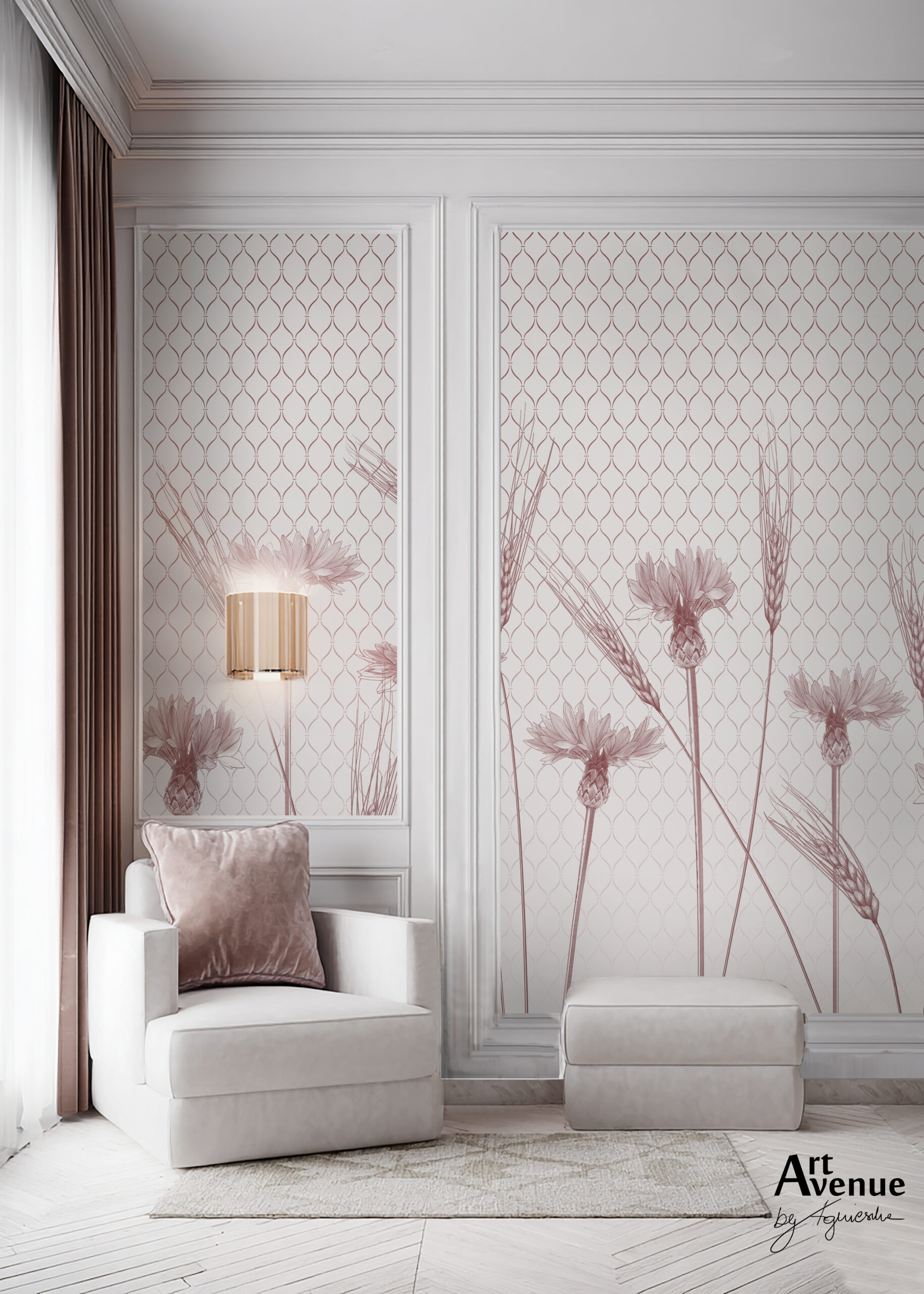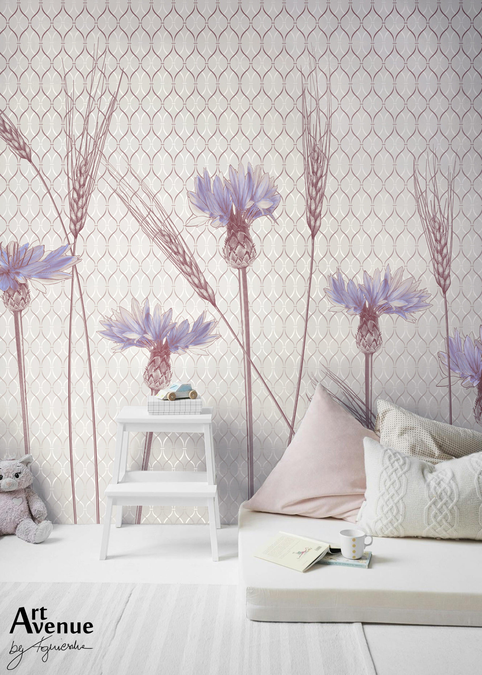 Jasna, pastelowa wariacja powstała z połączenia podwójnej mozaiki z kwiatową grafiką i dodatkiem polnych kłosów. Tło w barwie chłodnego różu z dodatkiem fioletu, bieli i chabrowych akcentów zamieni w bajkę dziewczęcy pokój. Artystyczna tapeta ścienna PREMIUM z motywem graficznym – na wymiar.