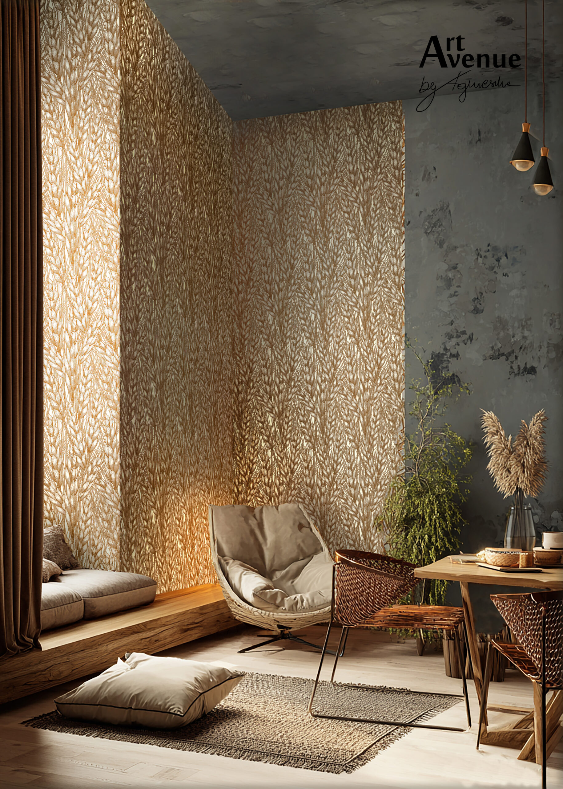 Tapeta powstała z graficznej przeplatanki zbudowanej z kłosów. Ten wyjątkowy, sielski wzór wykonany z dużą precyzją stanowi dominantę powstałą z myślą o dekorowaniu ścian piekarni bądź obiektów agroturystycznych. Artystyczna tapeta ścienna PREMIUM z motywem graficznym – na wymiar.