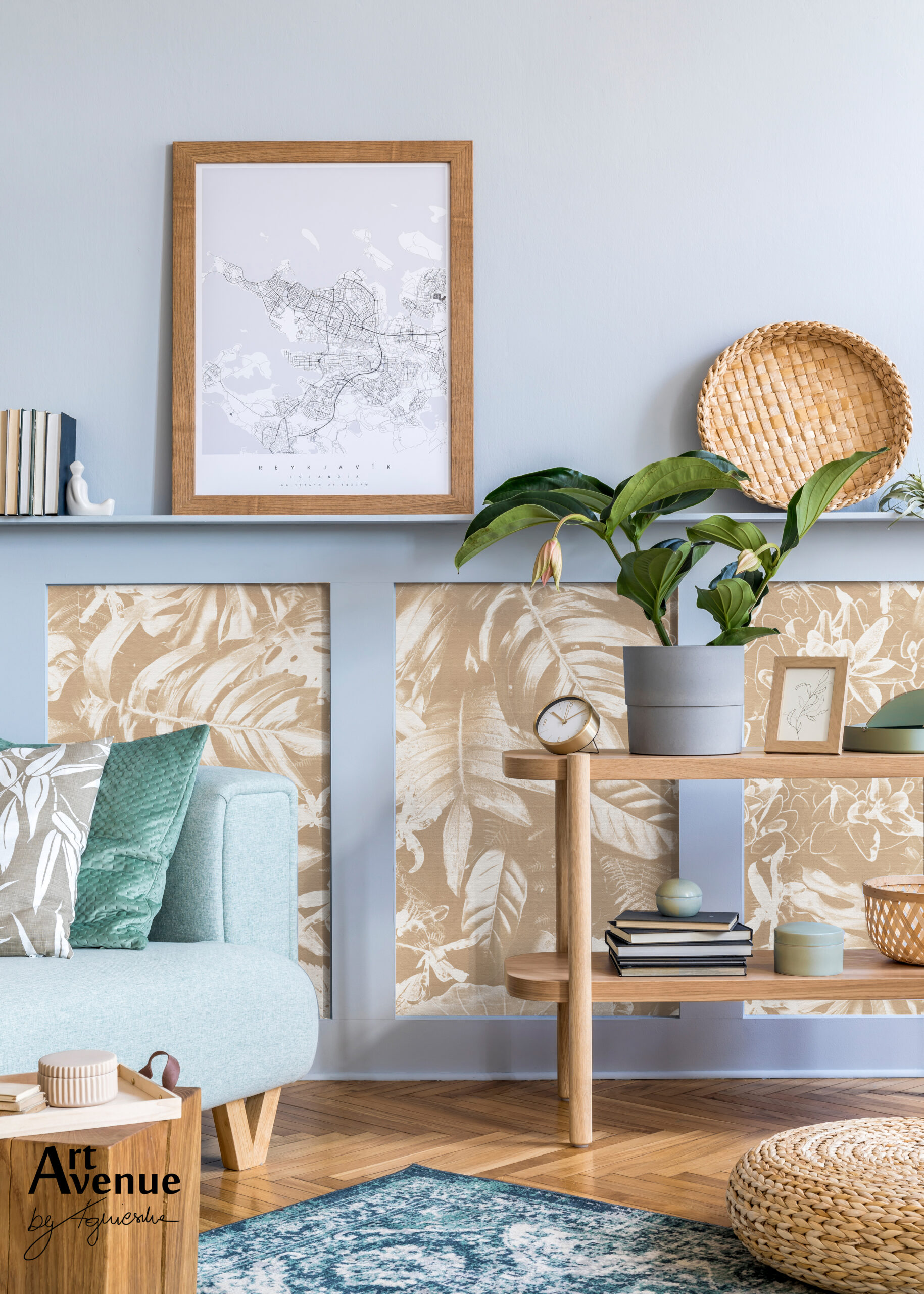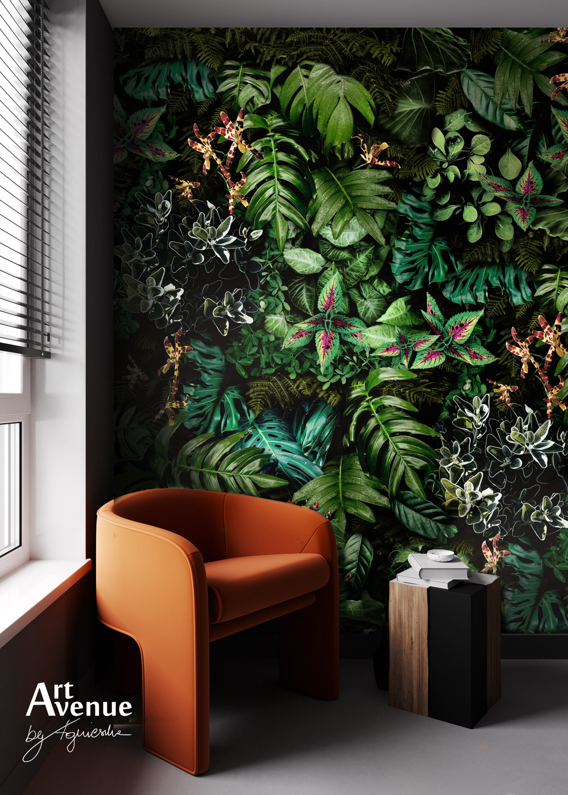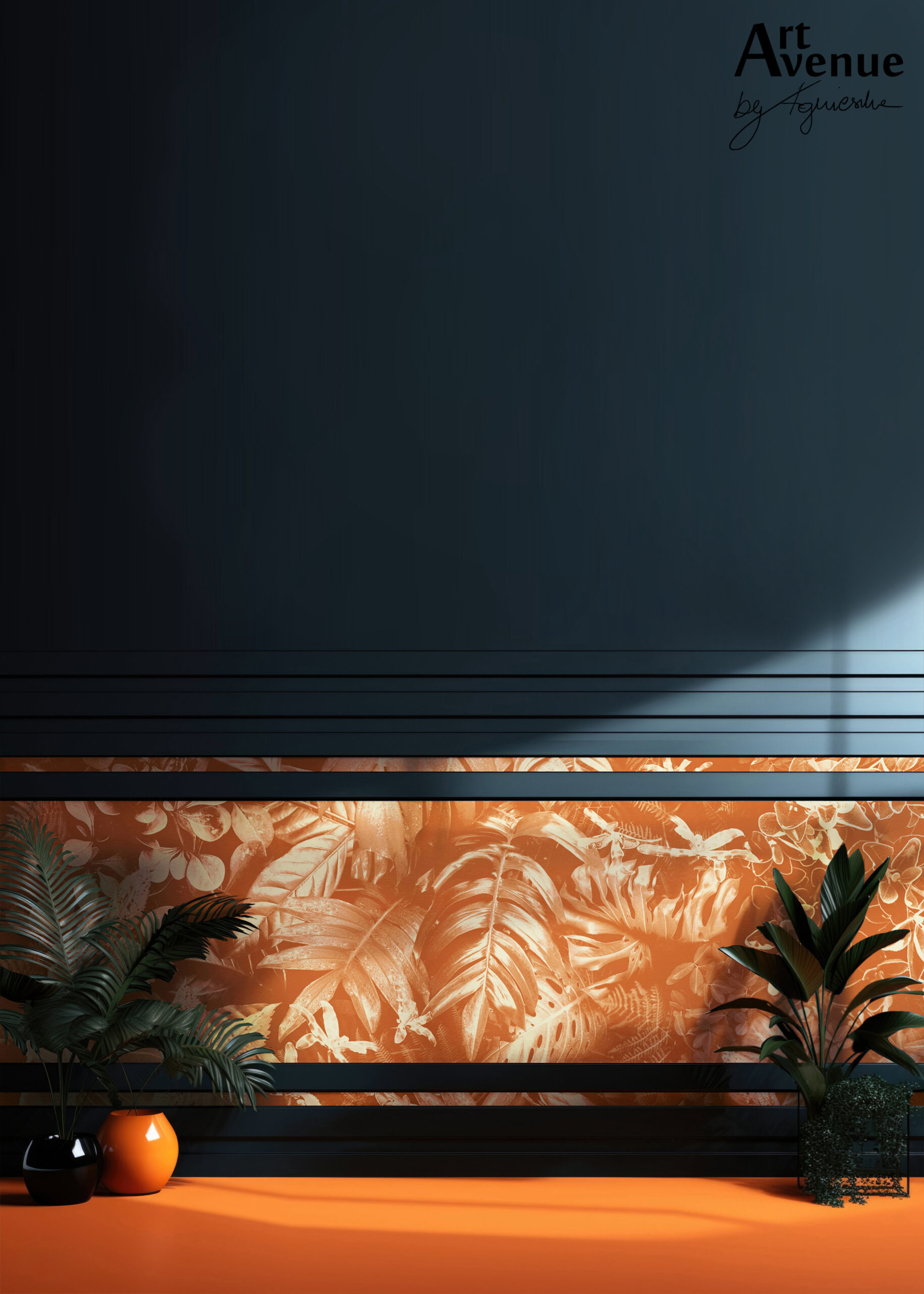 Skrywa ożywczy mix w kolorze nieco przygaszonej pomarańczy z bogatą kompozycją roślinną. Ta tapeta ma ukryty potencjał artystyczny do odważnych, kontrastowych projektów, wypełnień wnęk mebli i innych powierzchni. Artystyczna tapeta ścienna PREMIUM z motywem graficznym – na wymiar.