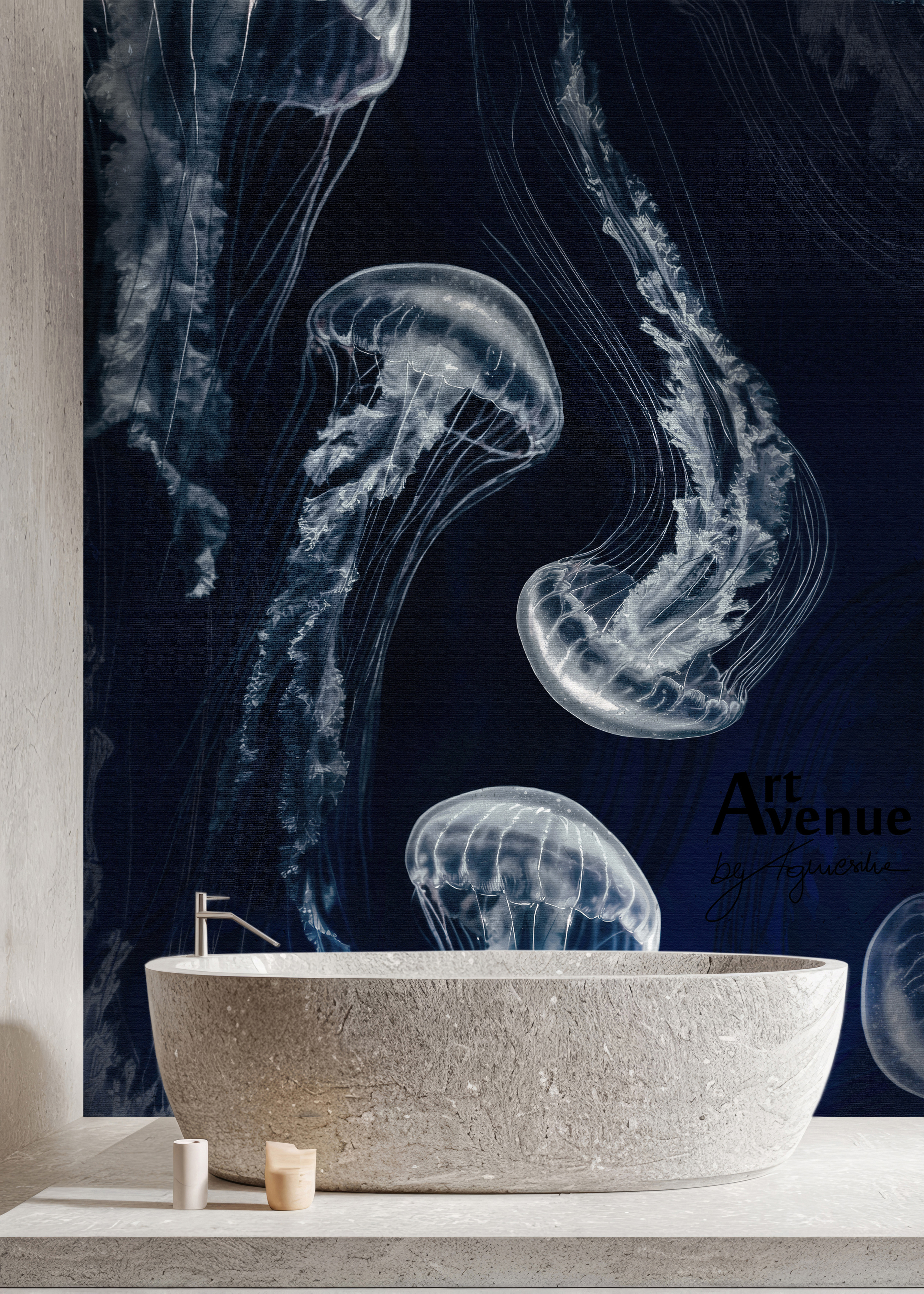 Przedstawia tańczące meduzy w granatowych głębinach oceanu. Symbolika jej ujęcia i barwy odnosi się do spokoju, harmonii i mądrości jaką reprezentuje podwodny świat. Zaprojektowana dla Twojej łazienki. Artystyczna tapeta ścienna PREMIUM z motywem graficznym – na wymiar.