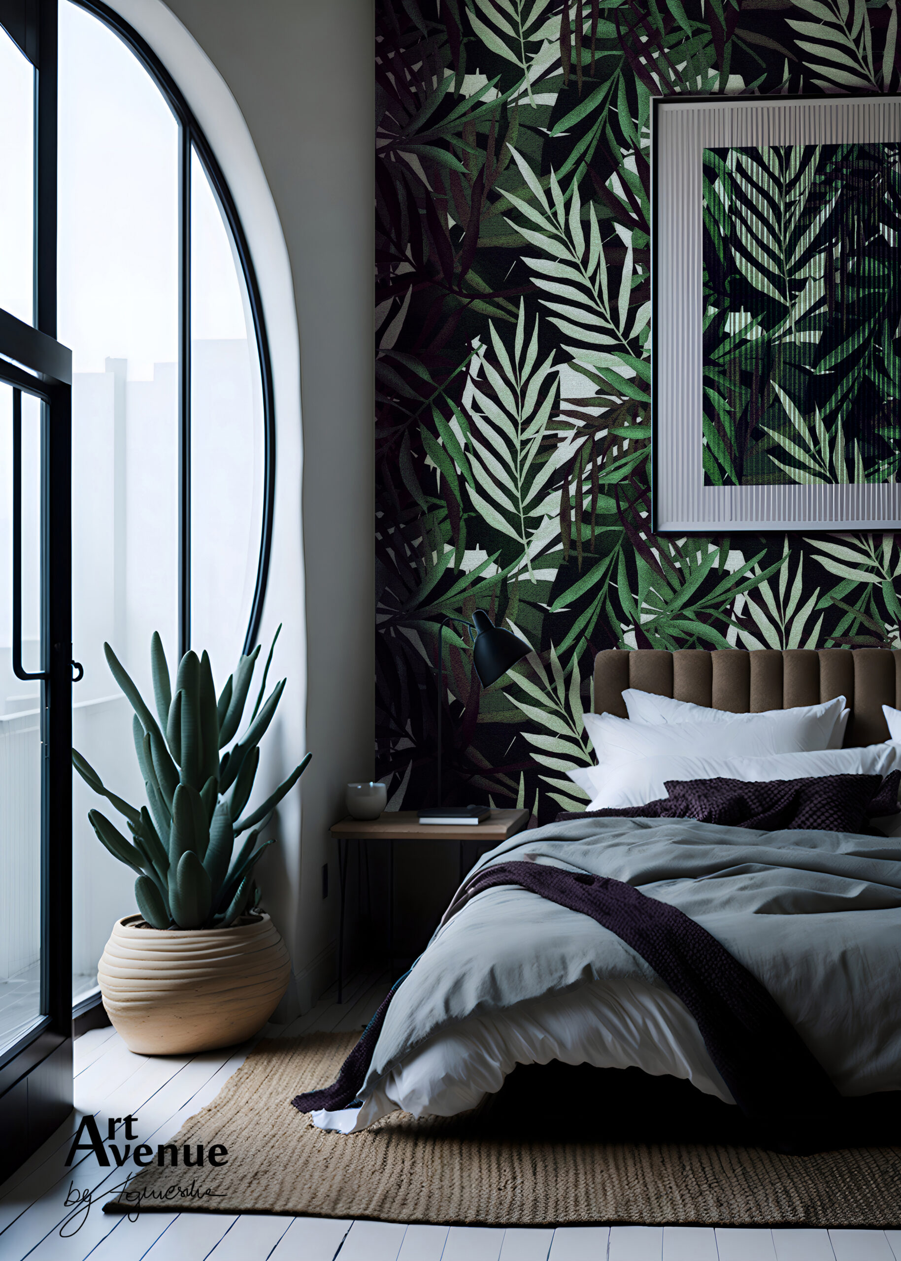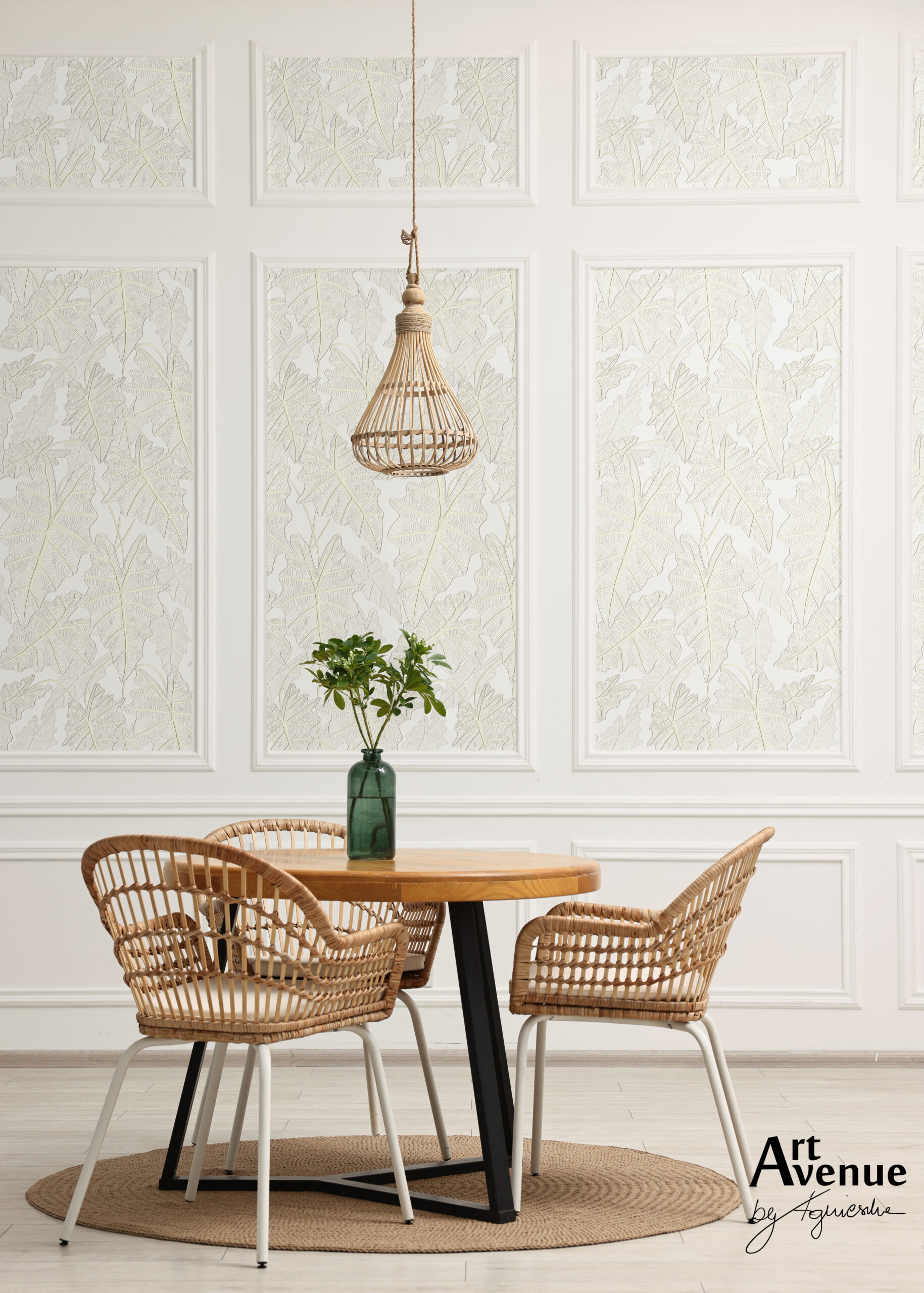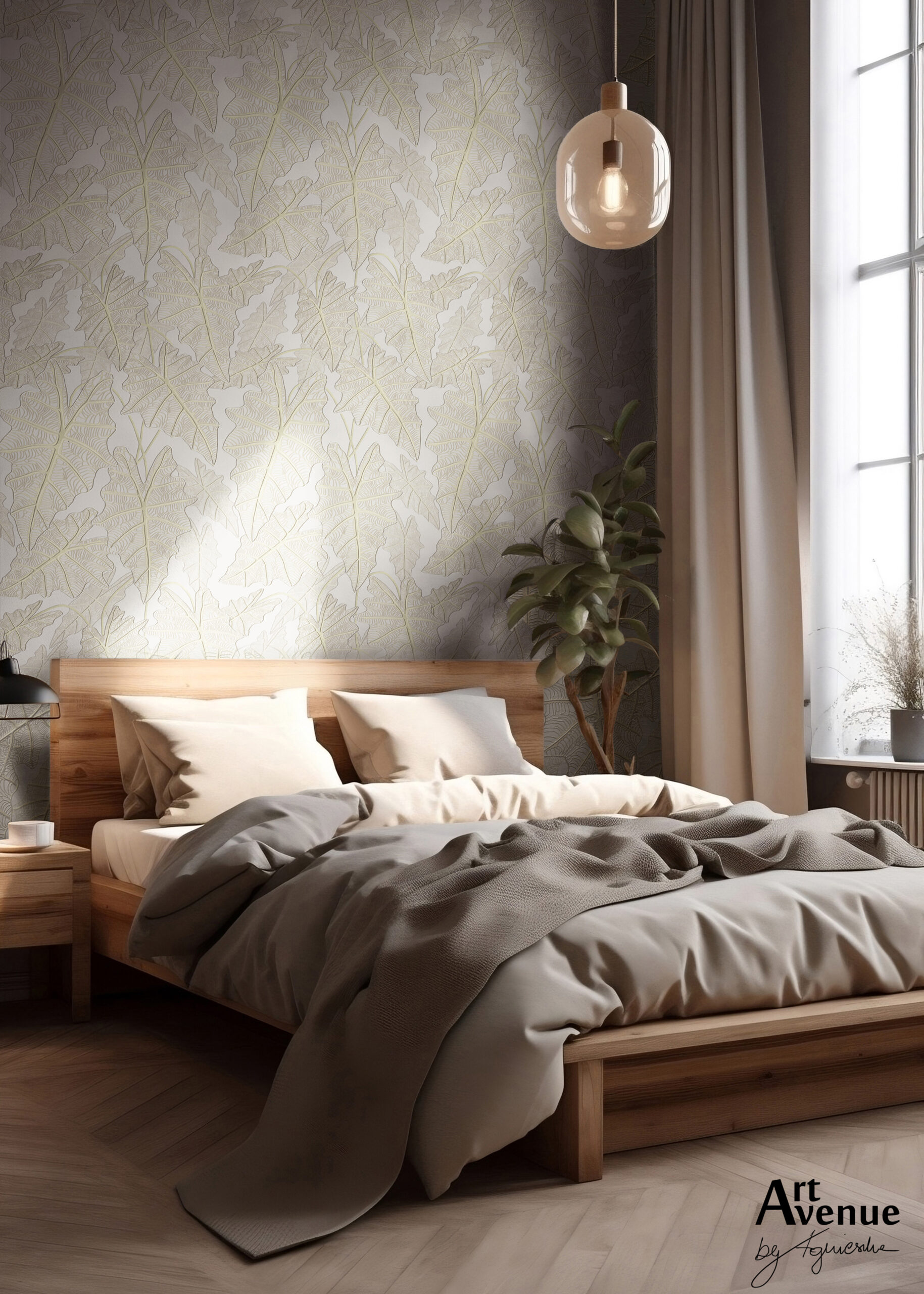 Jasnoszara propozycja z liśćmi alokazji, która stworzy subtelny nastrój w Twojej sypialni. To nienachalny sposób na otoczenie się motywem roślinnym, posiada ożywcze pożółcenia w nerwacji liści dające niebanalny efekt. Artystyczna tapeta ścienna PREMIUM z motywem botanicznym – na wymiar.