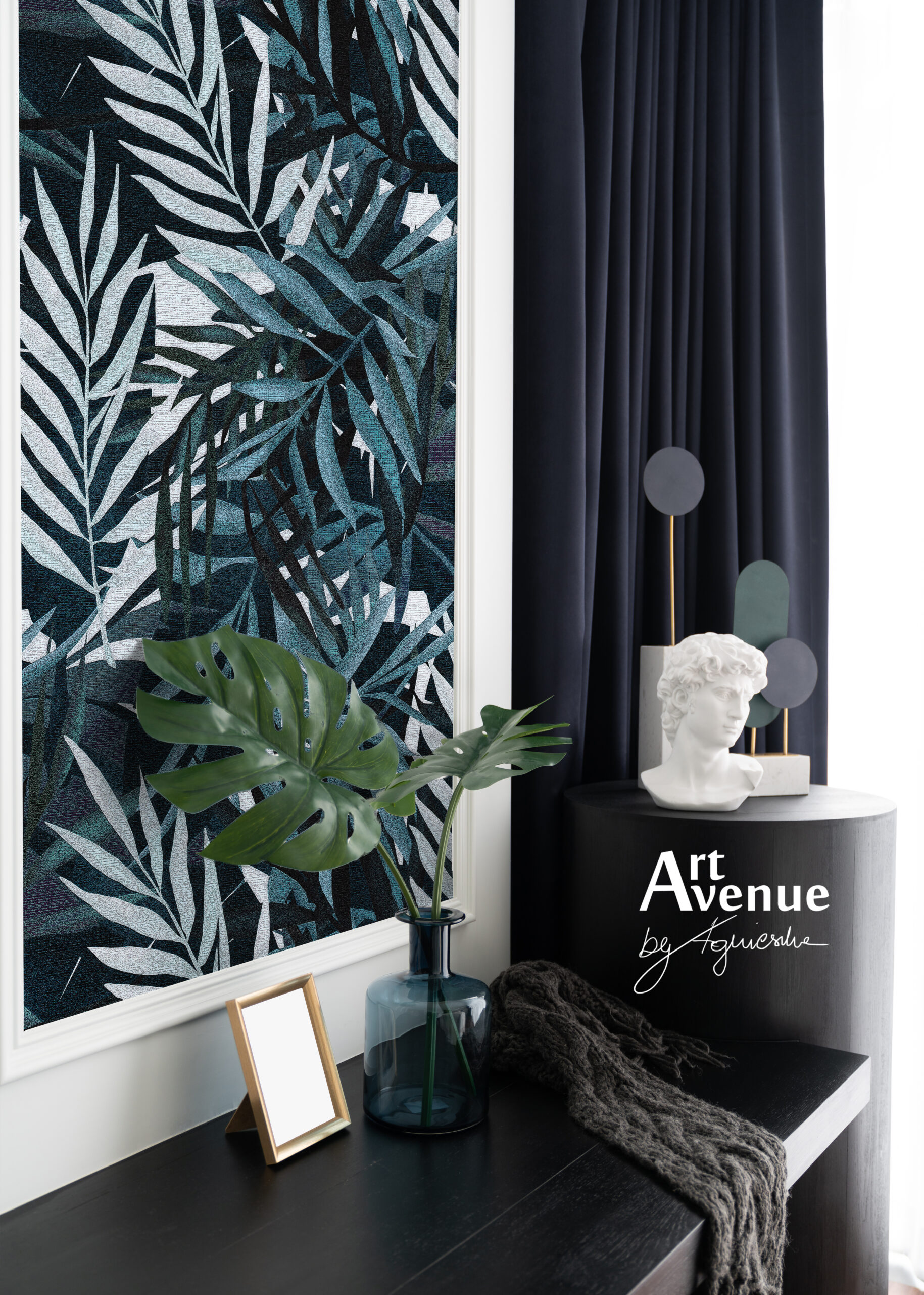 Przedstawia monokolorową szatę roślinną w eleganckim granatowym kolorze, która powstała z myślą o tworzeniu niesamowitych połączeń gładkich powierzchni urozmaiconych. Artystyczna tapeta ścienna PREMIUM z motywem graficznym – na wymiar.