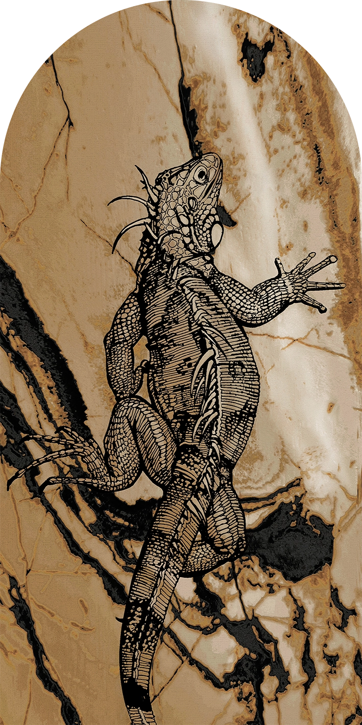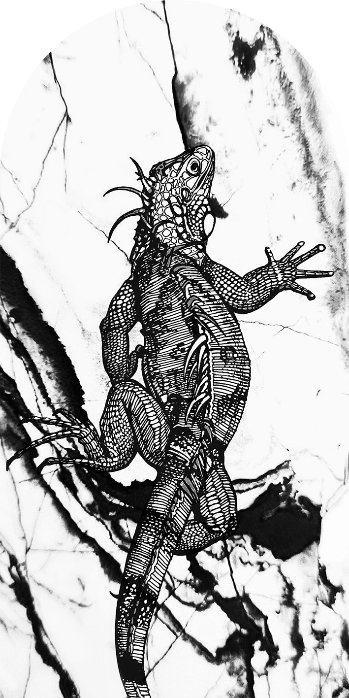 Wyjątkowy, ręcznie rysowany wzór z iguaną scalony z czarno-białą kompozycją marmuru, by zapewnić Waszym wnętrzom fuzję egzotyki i elegancji przy abstrakcyjnym ujęciu rys i pęknięć akcentujących konary drzew. Artystyczna tapeta ścienna PREMIUM z organicznym wzorem do zastosowania na ścianie, kaflach, meblach – w kształcie łuku o wymiarach 240×120 cm.