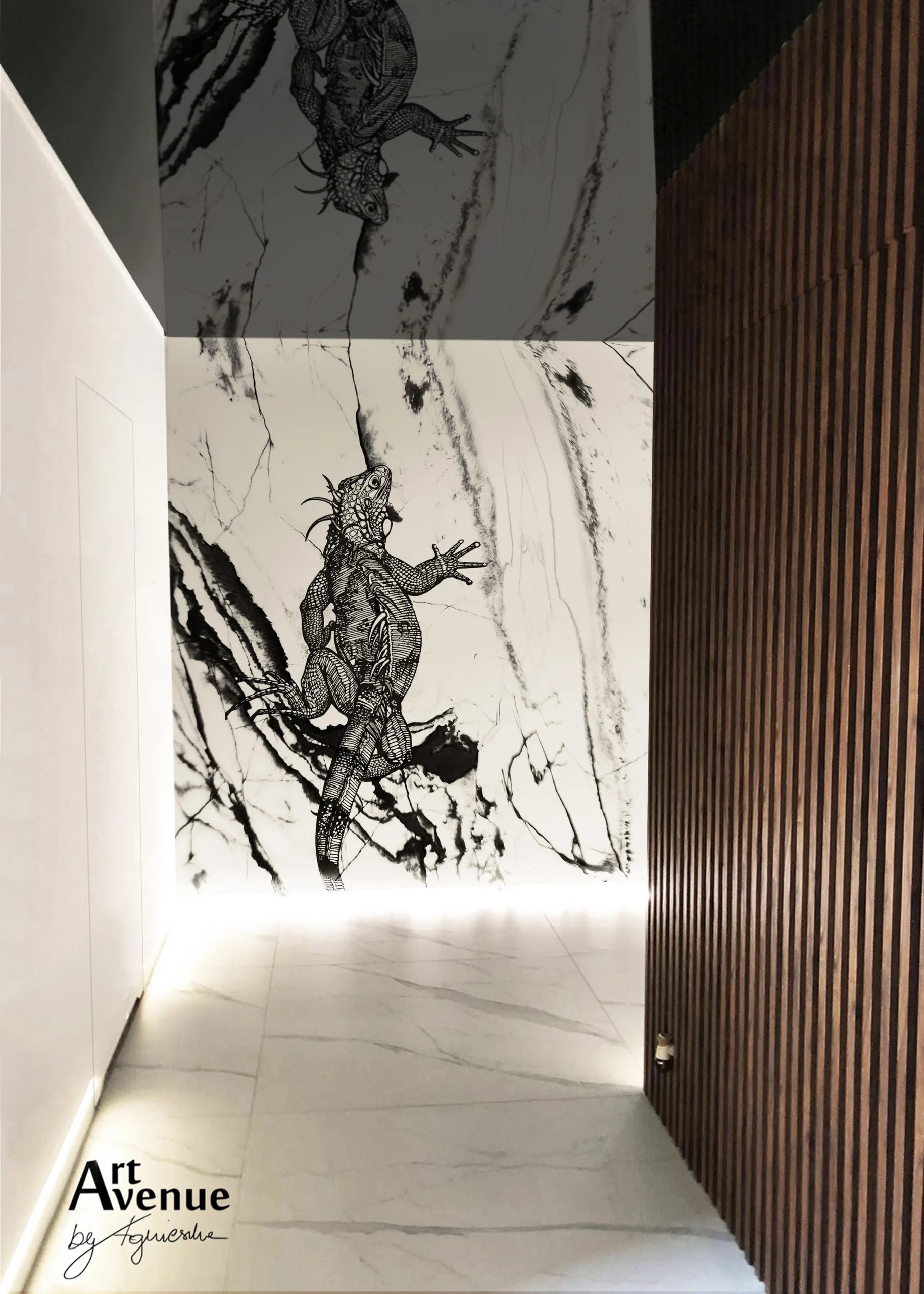 Wyjątkowy, ręcznie rysowany wzór z iguaną scalony z czarno-białą kompozycją marmuru, by zapewnić Waszym wnętrzom fuzję egzotyki i elegancji przy abstrakcyjnym ujęciu rys i pęknięć akcentujących konary drzew. Artystyczna tapeta ścienna PREMIUM z organicznie wtopionym wzorem – na wymiar.