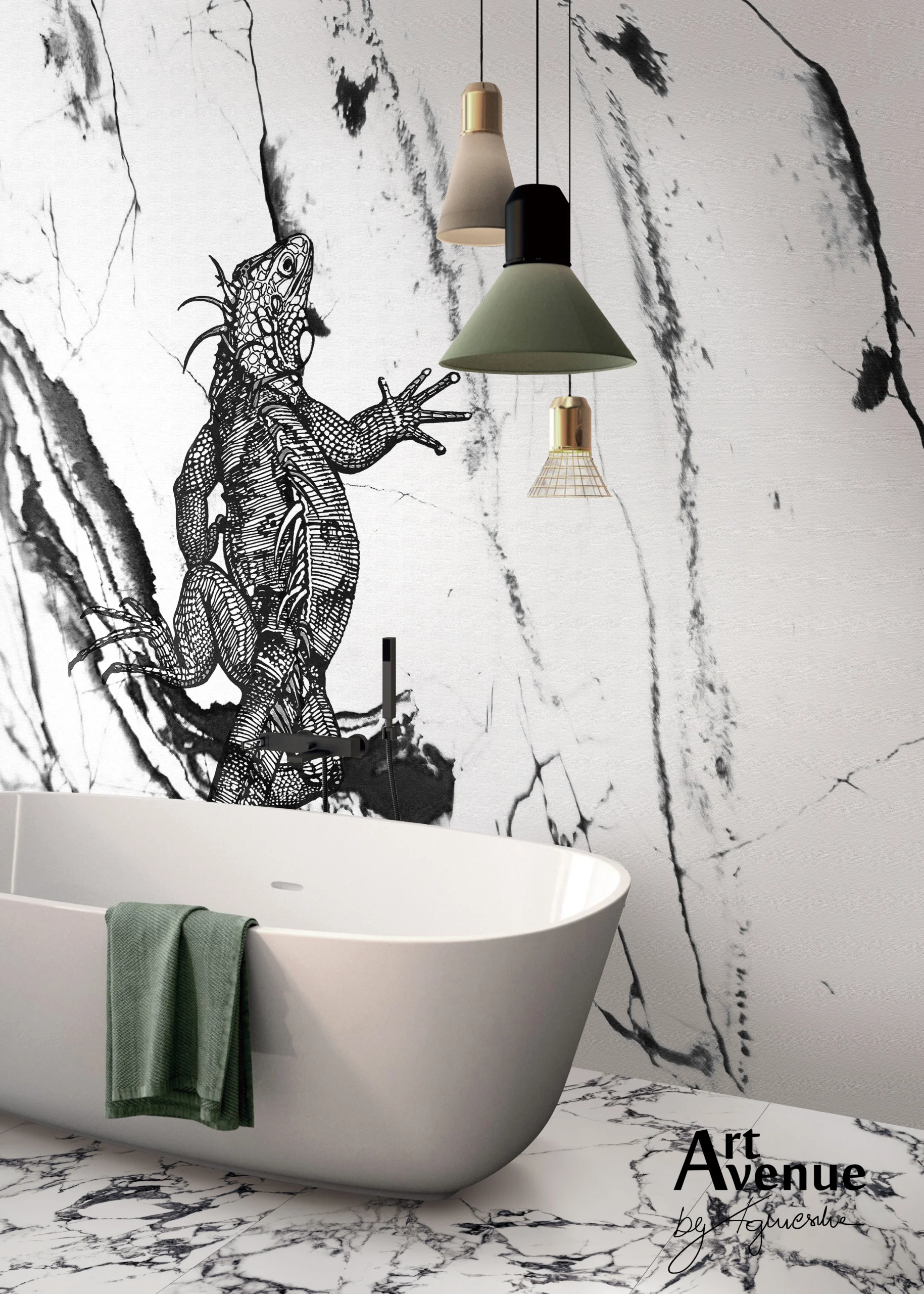 Wyjątkowy, ręcznie rysowany wzór z iguaną scalony z czarno-białą kompozycją marmuru, by zapewnić Waszym wnętrzom fuzję egzotyki i elegancji przy abstrakcyjnym ujęciu rys i pęknięć akcentujących konary drzew. Artystyczna tapeta ścienna PREMIUM z organicznie wtopionym wzorem – na rolki.