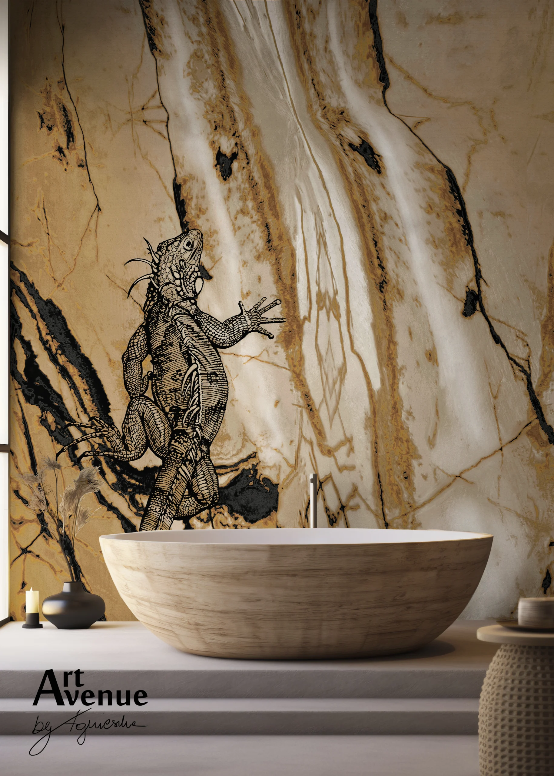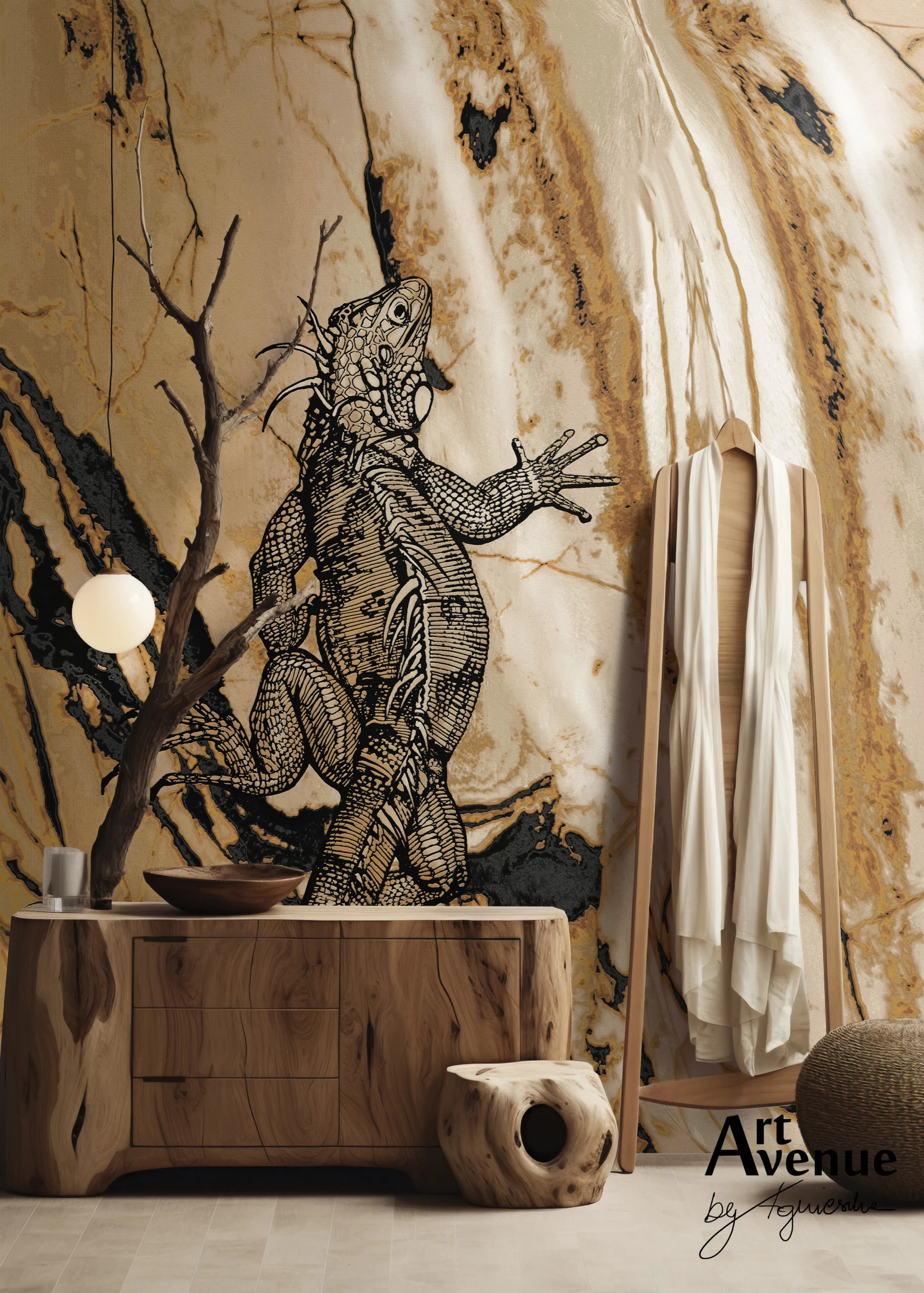 Wyjątkowy, ręcznie rysowany wzór z iguaną w gorącym klimacie sawanny na tle piaskowo-złocistego marmuru. Uatrakcyjni i ociepli wnętrze dodając mu szyku w stylu Modern Safari. Artystyczna tapeta ścienna PREMIUM z organicznie wtopionym wzorem – na rolki.