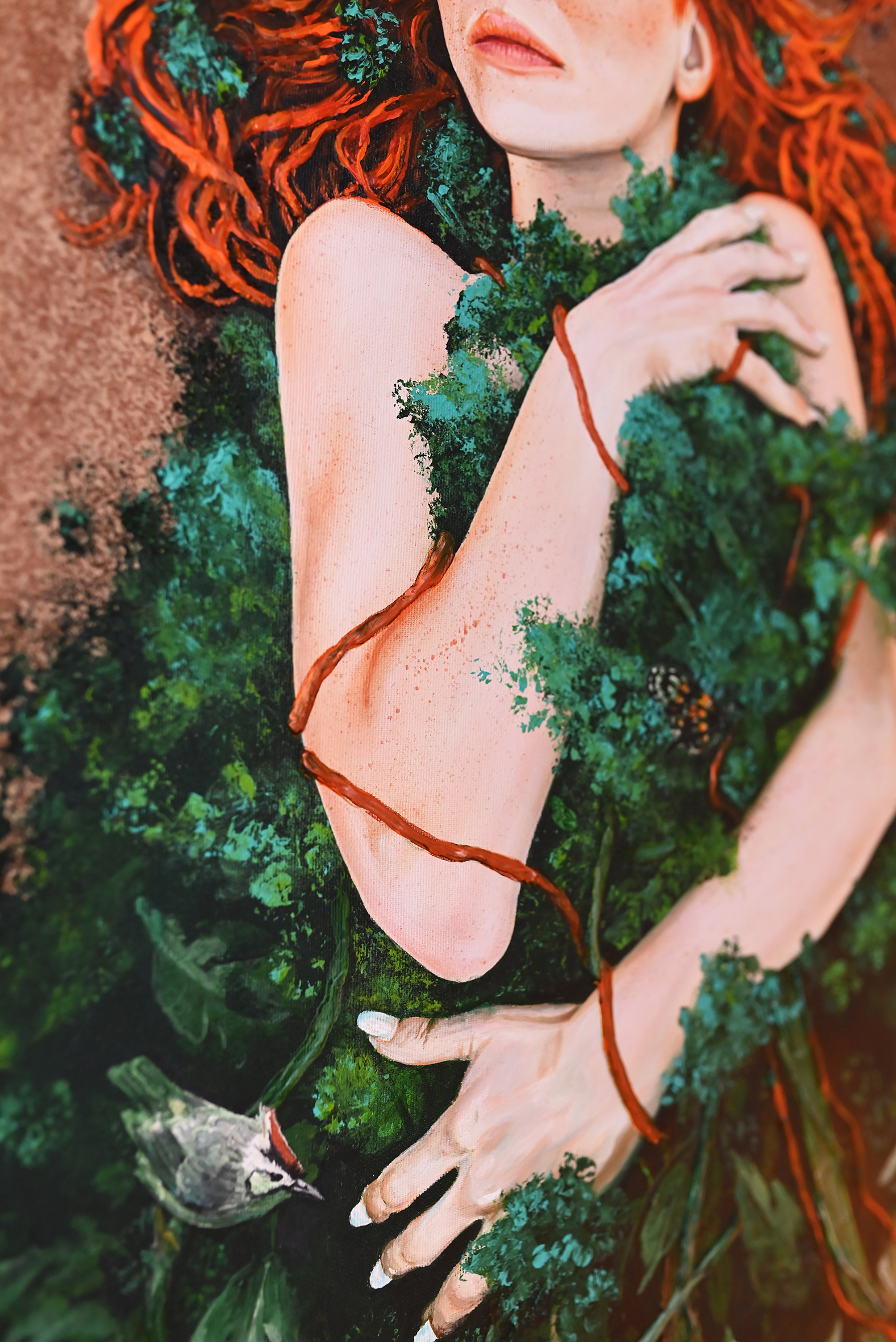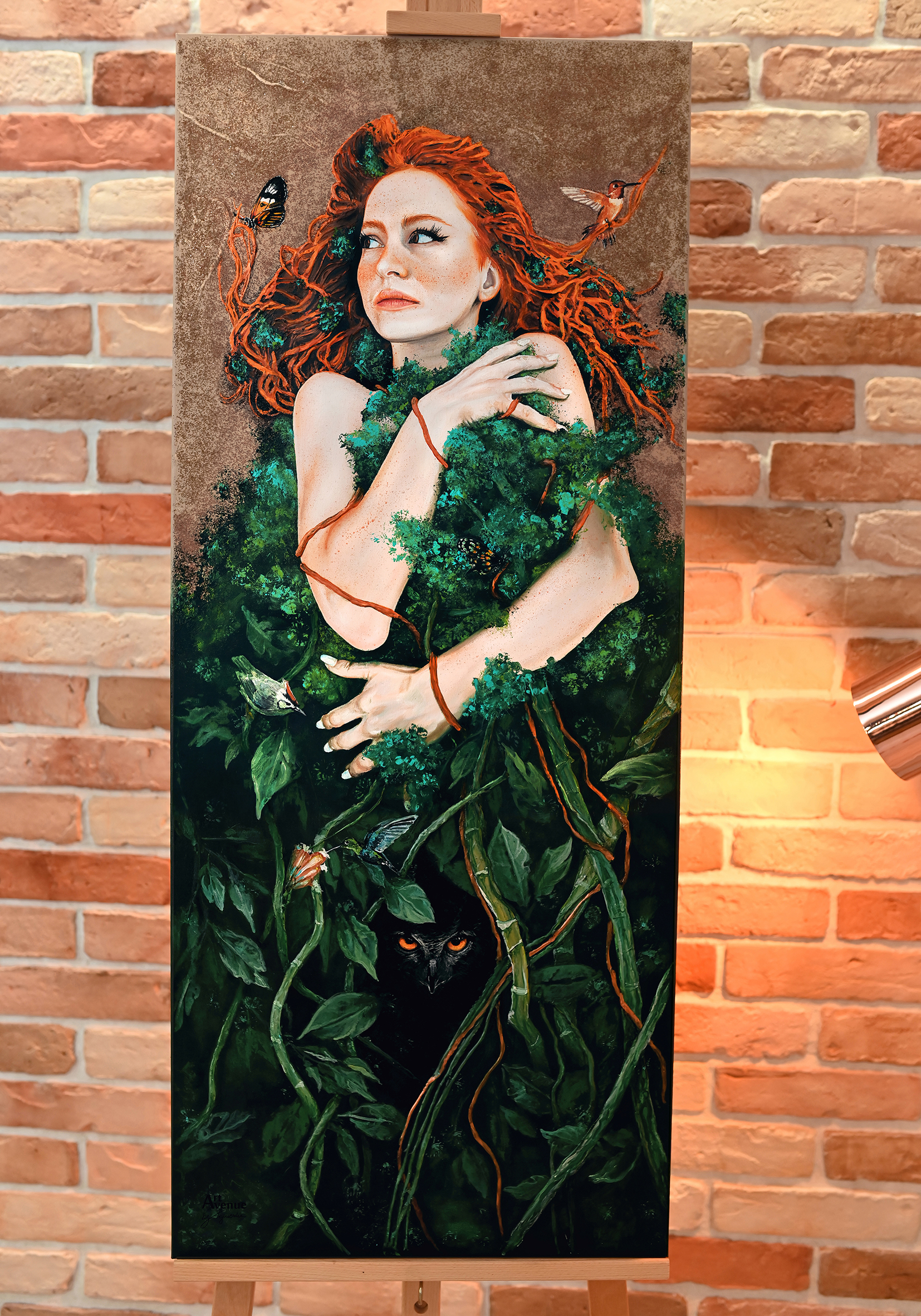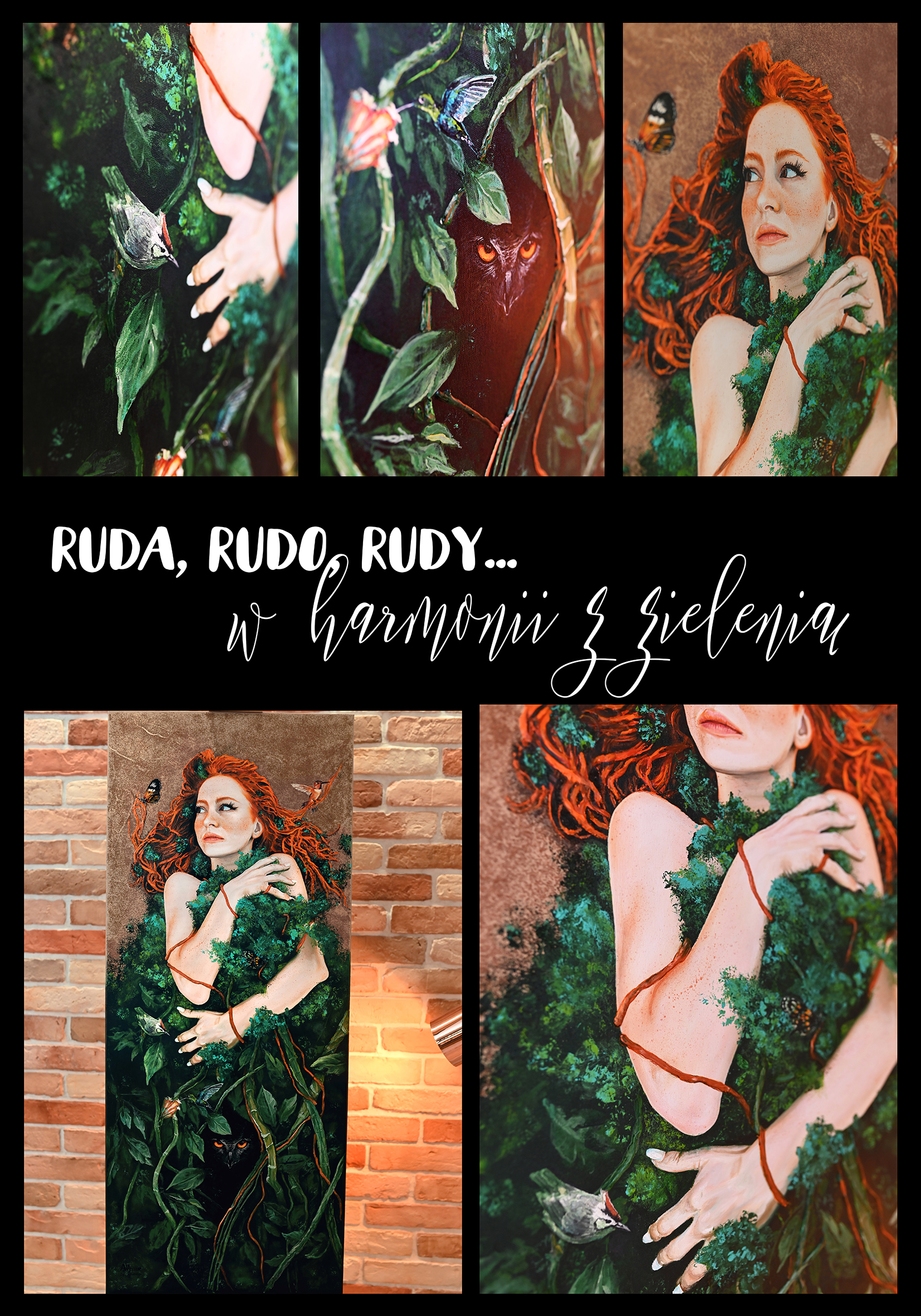 Oryginalny obraz akrylowy na płótnie o soczystych rudych i zielonych barwach o głęboko emocjonalnym przekazie pracy. Zachwyca nie tylko kobiecością, ale i swym odniesieniem do piękna natury. Obraz pasujący do wnętrz w różnych stylach m. in. Nature Inspired.