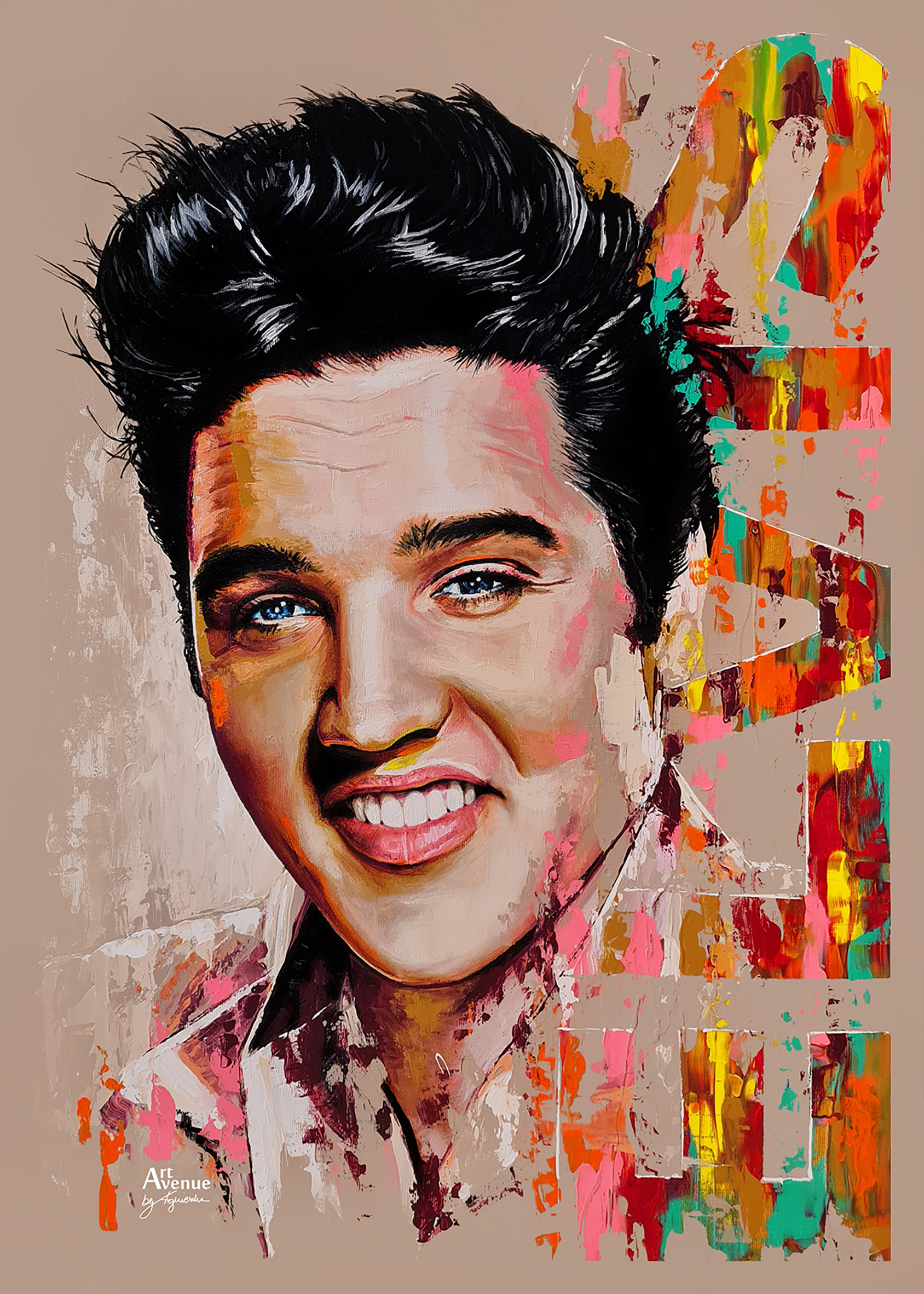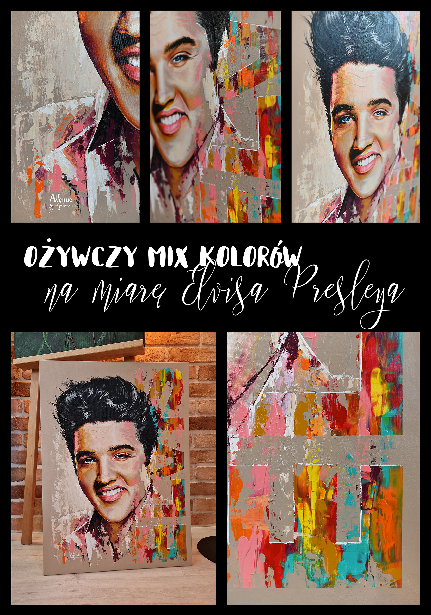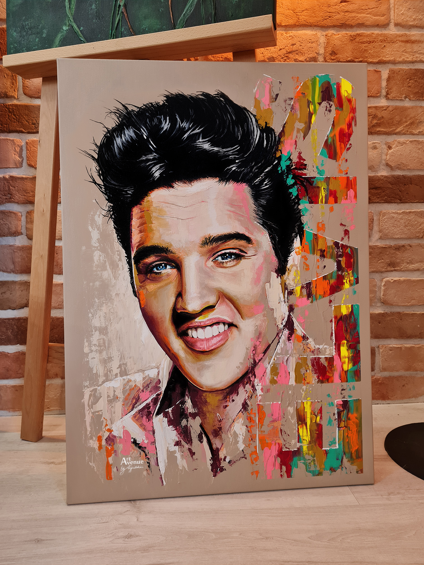 Obraz akrylowy na płótnie przedstawiający eklektyczny portret Elvisa Presley’a. Ekspresyjne pociągnięcia szpachli i pędzla o nasyconych barwach zjawiskowo oddają naturę króla rock’n’roll’a. Wyważone kolorystycznie tło pozwala dopasować obraz do niejednego wnętrza.