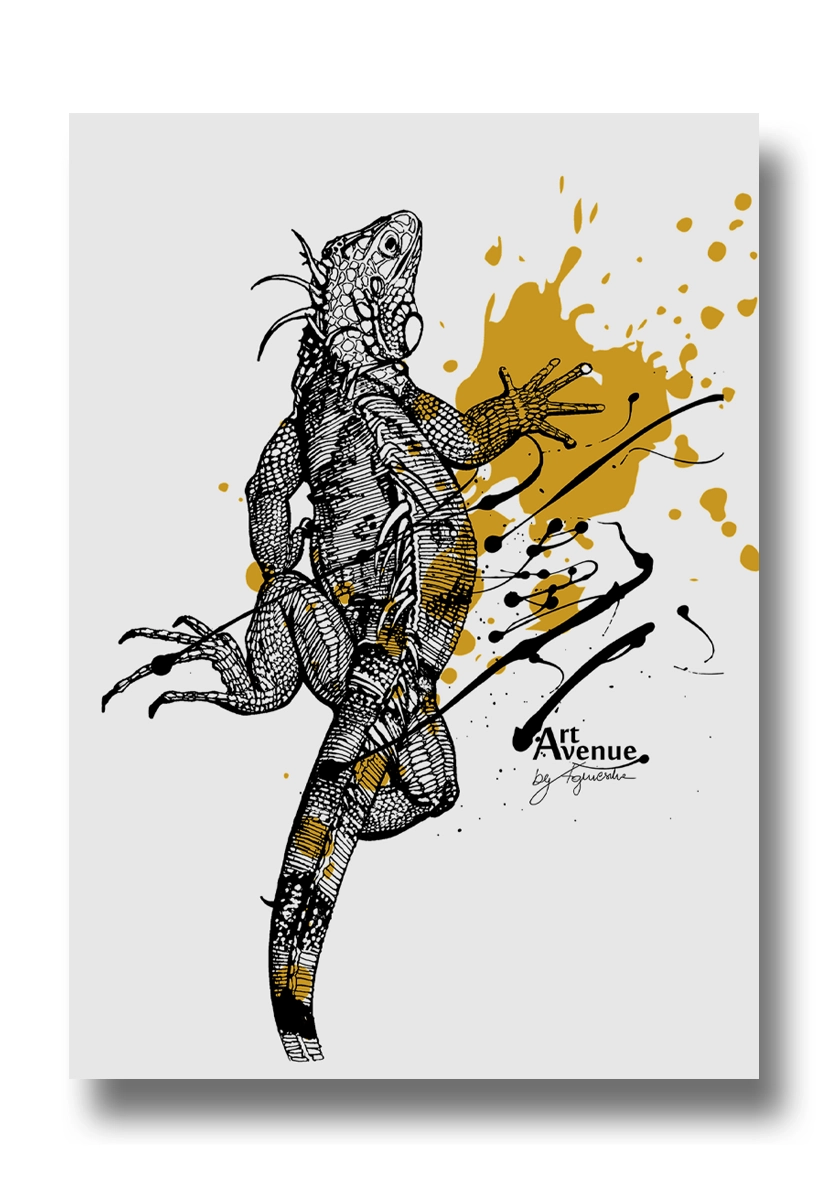 Ręcznie rysowana linearna iguana, to egzotyczny i wyrazisty motyw osobowości z barwnym „kleksem”, możliwym do łatwej personalizacji w inne barwy. Rysunek przeobrażony w wysokojakościową grafikę nadającą się nie tylko do druku na plakatach, ale i koszulkach, tapetach i wielu innych podkładach i formatach. Jedyny motyw plakatu z wyraźnym, centralnie osadzonym logiem marki Art Avenue by Agnieszka.