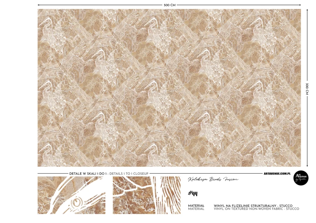 Linearna kompozycja na bazie podziałów heksagonalnych zbudowana z wdzięcznych ptasich grafik m. in. żarawi, pawi i czapli. Przeplatający się rysunek wykonano na pięknym kamiennym tle różnicując jego płaszczyzny co daje niebanalny, elegancki efekt. Artystyczna tapeta ścienna PREMIUM z motywem ornitplogicznym – na rolki.