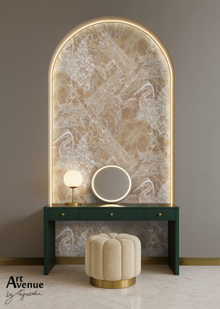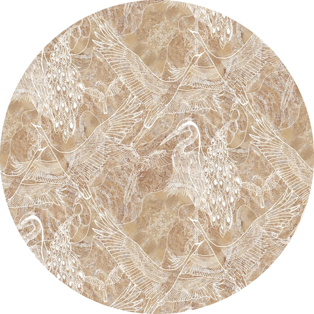Linearna kompozycja na bazie podziałów heksagonalnych zbudowana z wdzięcznych ptasich grafik m. in. żarawi, pawi i czapli. Przeplatający się rysunek wykonano na pięknym kamiennym tle różnicując jego płaszczyzny co daje niebanalny, elegancki efekt. Artystyczna tapeta ścienna PREMIUM z motywem ornitplogicznym – na rolki.