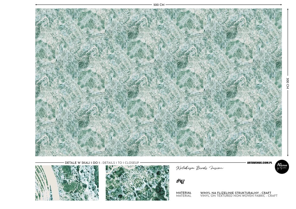 Zawiera w sobie przepiękny wzór linearny z uwielbianymi motywami ptaków jak np. czapla, paw, żuraw, który subtelnie przebija z melanżu kolorów niebieskich i zielonych faktur tworząc artystyczny charakter ściany. Artystyczna tapeta ścienna PREMIUM z motywem ornitologicznym – na rolki.
