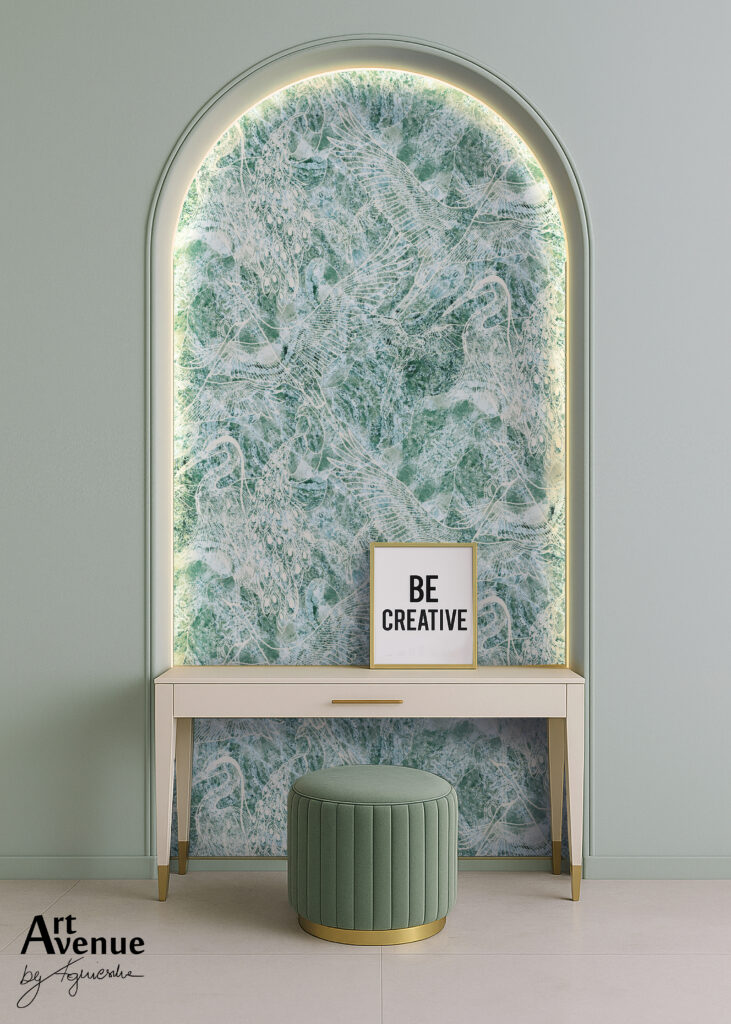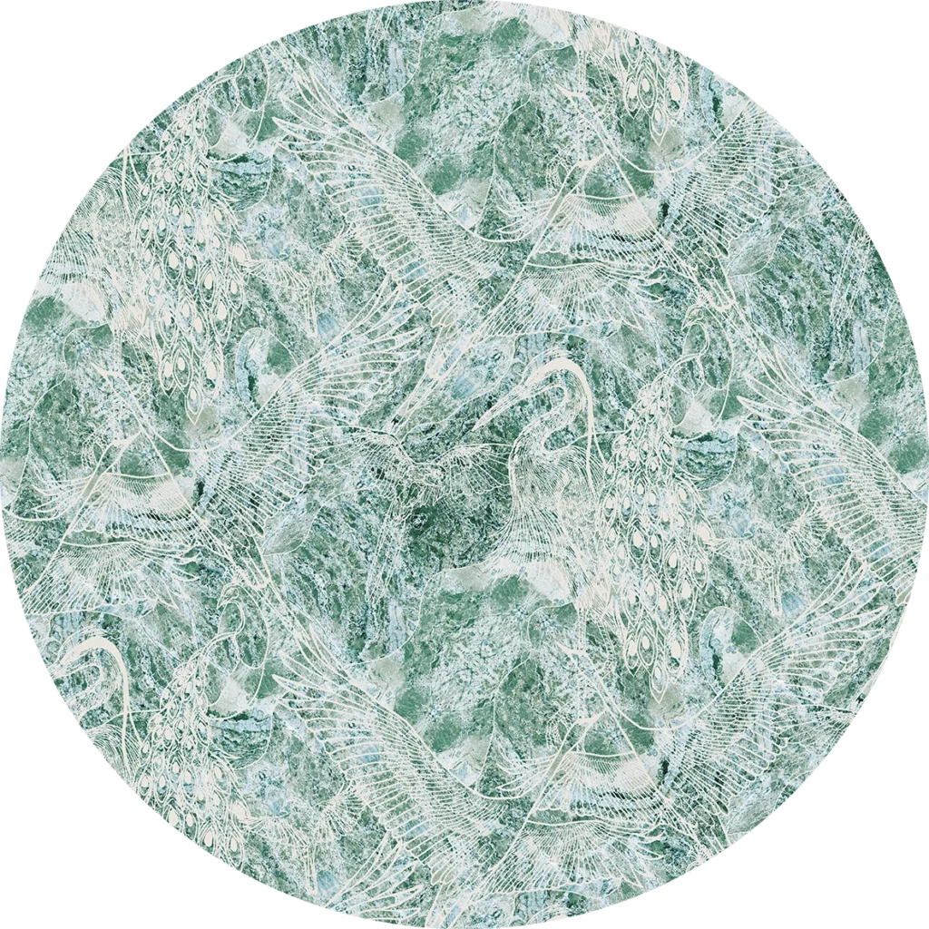Zawiera w sobie przepiękny wzór linearny z uwielbianymi motywami ptaków jak np. czapla, paw, żuraw, który subtelnie przebija z melanżu kolorów niebieskich i zielonych faktur tworząc artystyczny charakter ściany. Artystyczna tapeta ścienna PREMIUM z motywem ornitologicznym – na rolki.