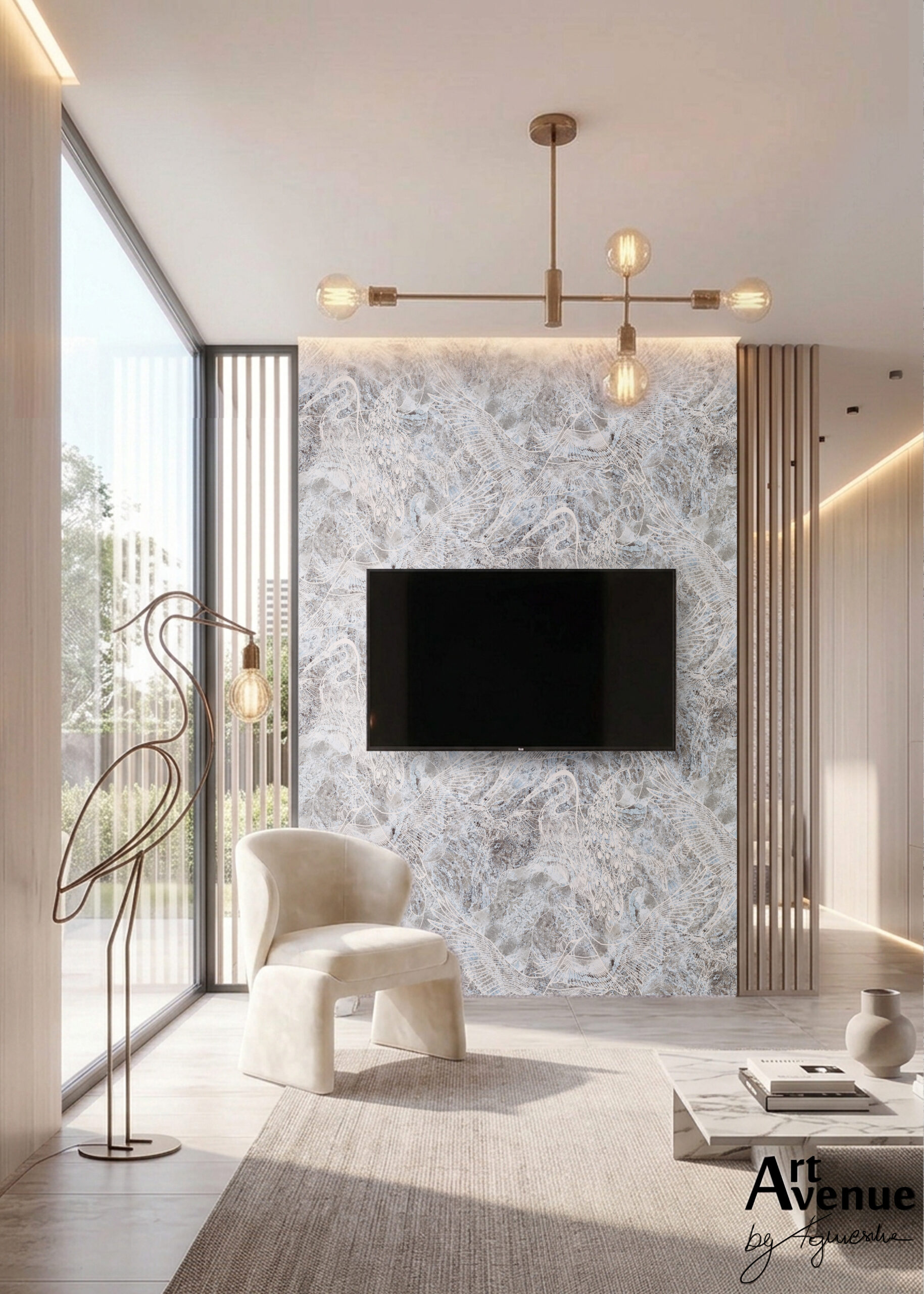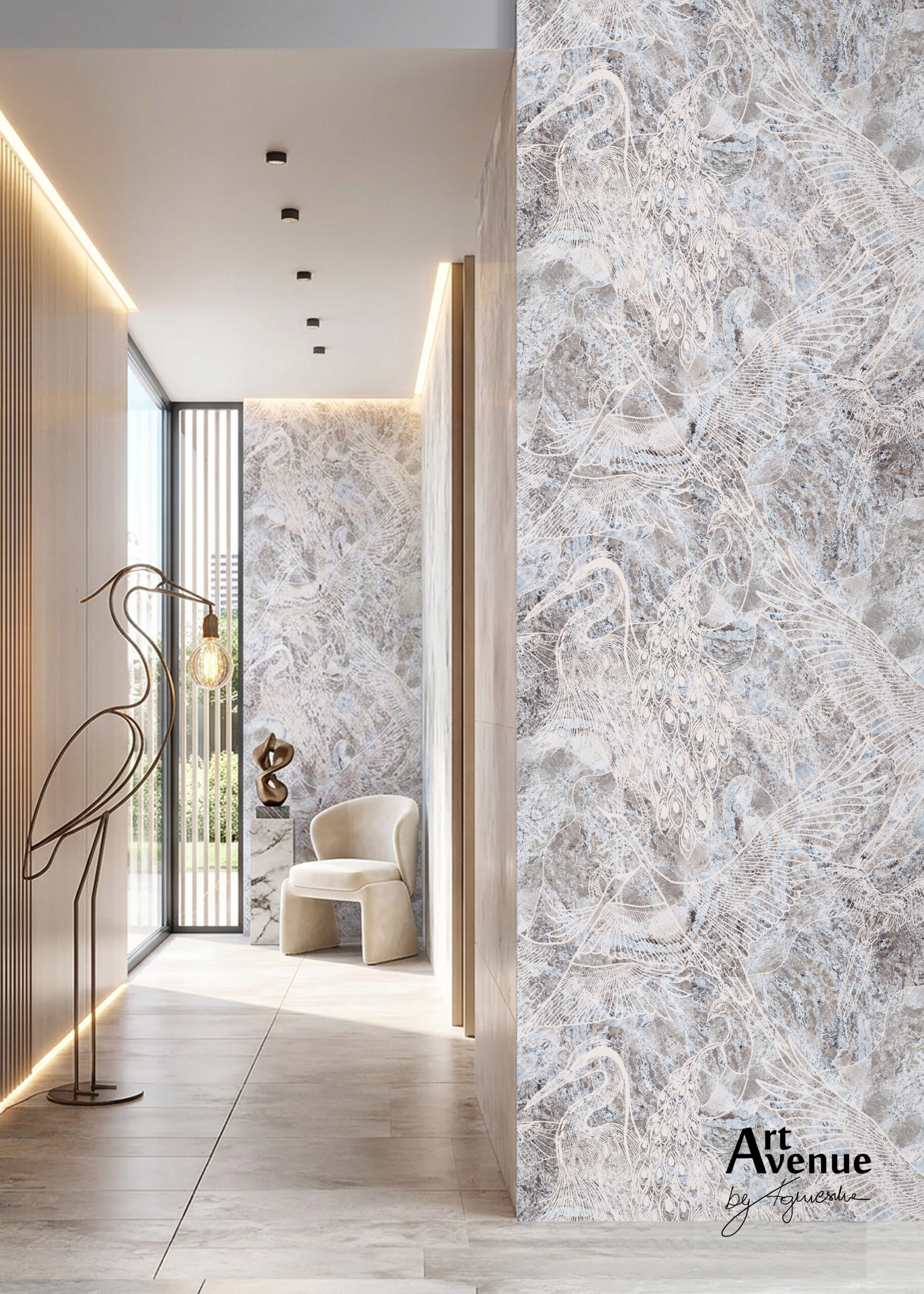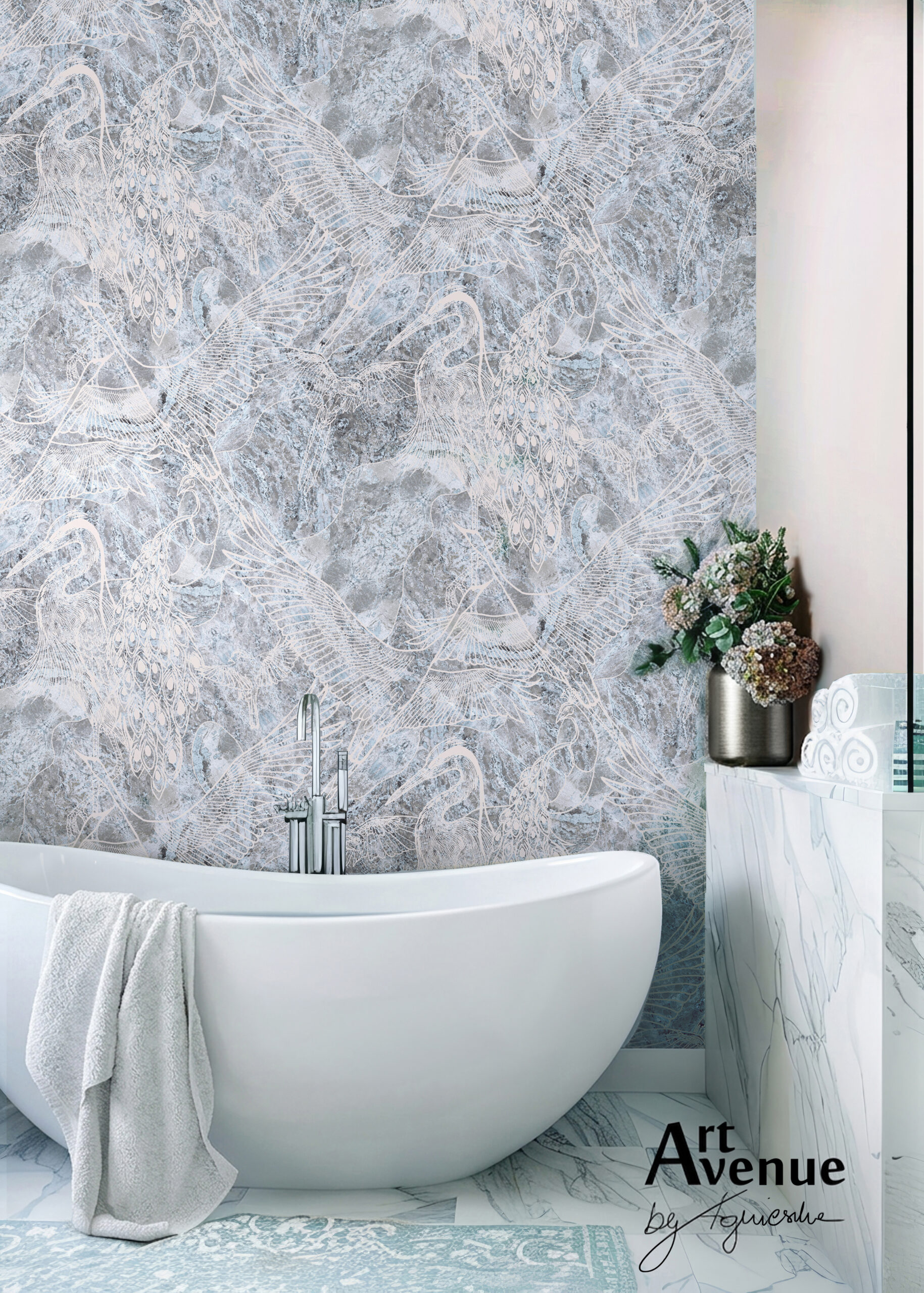 Przedstawia przepiękny ptasi wzór linearny powstały z ich białych grafik – sylwetek subtelnie przebijających się z melanżu fioletowo szarych i niebieskich faktur. Art’owy design ściany pasujący do różnych pomieszczeń. Artystyczna tapeta ścienna PREMIUM z motywem ornitologicznym – na rolki.