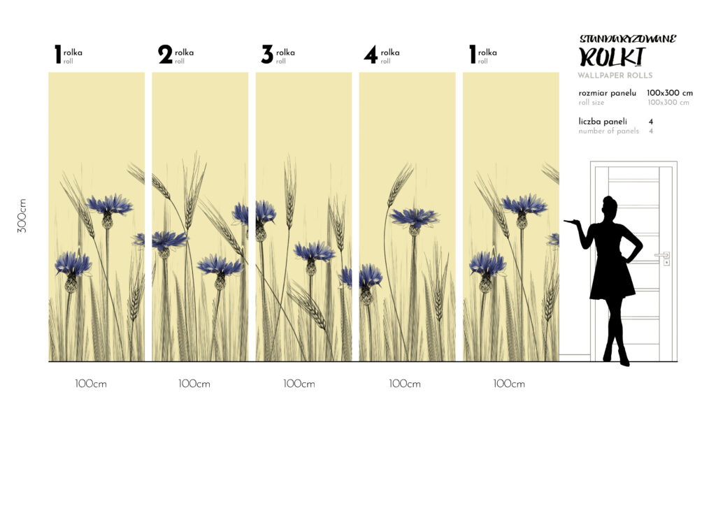 Wzór przedstawiający polne kłosy, jak jej pierwowzór buduje przyjazną atmosferę m. in. poprzez ciepłe tło. Wzbogacona została kontrastowym akcentem w kolorze chabrowym. Konsekwentnie dobierając dodatki zaaranżujesz atrakcyjną, barwną przestrzeń. Artystyczna tapeta ścienna PREMIUM z motywem graficznym – na rolki.