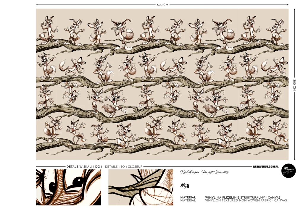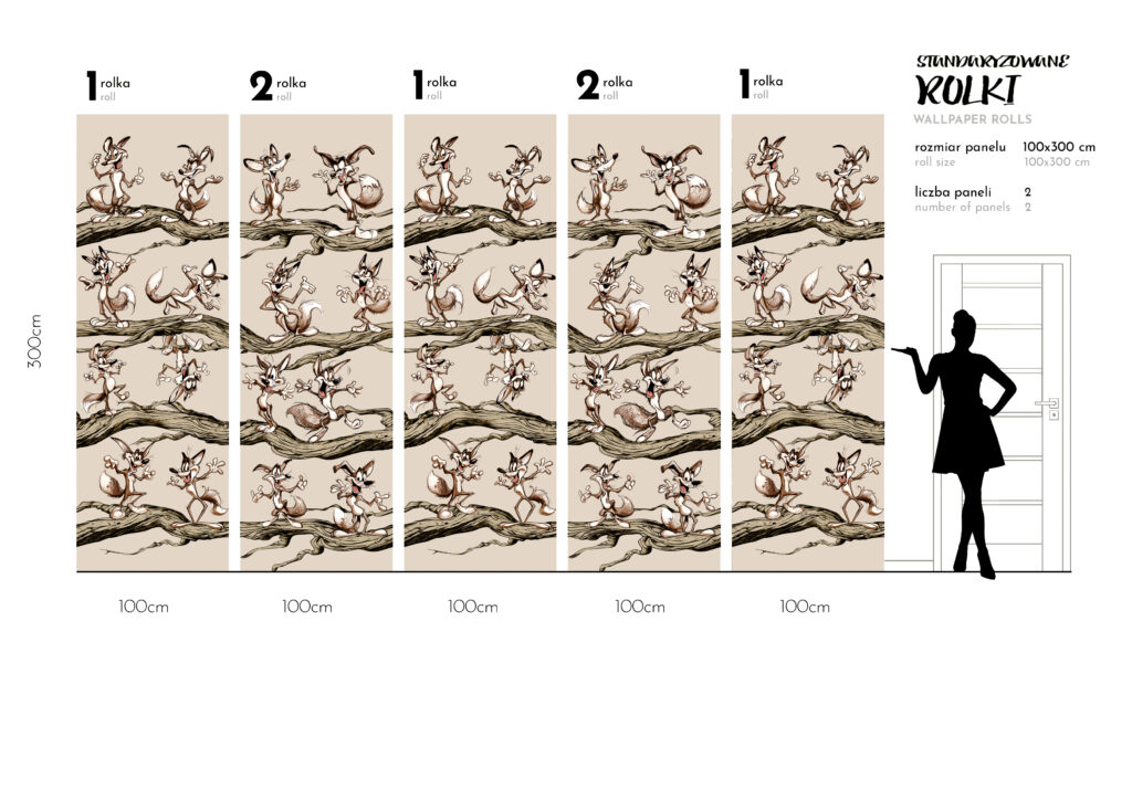 Kolorowa interpretacja wzoru z lisami. Te ilustracyjne postacie zyskały nową energię dzięki ziemistym akcentom. Rude i zielonkawe tony wprowadzają ciepło do dziecięcego wnętrza. Humorystyczny detal, pogodny, bajkowy klimat. Artystyczna tapeta ścienna PREMIUM z motywem graficznym – na rolki.