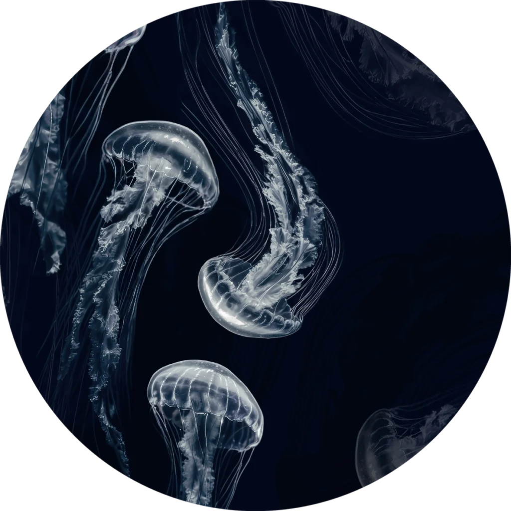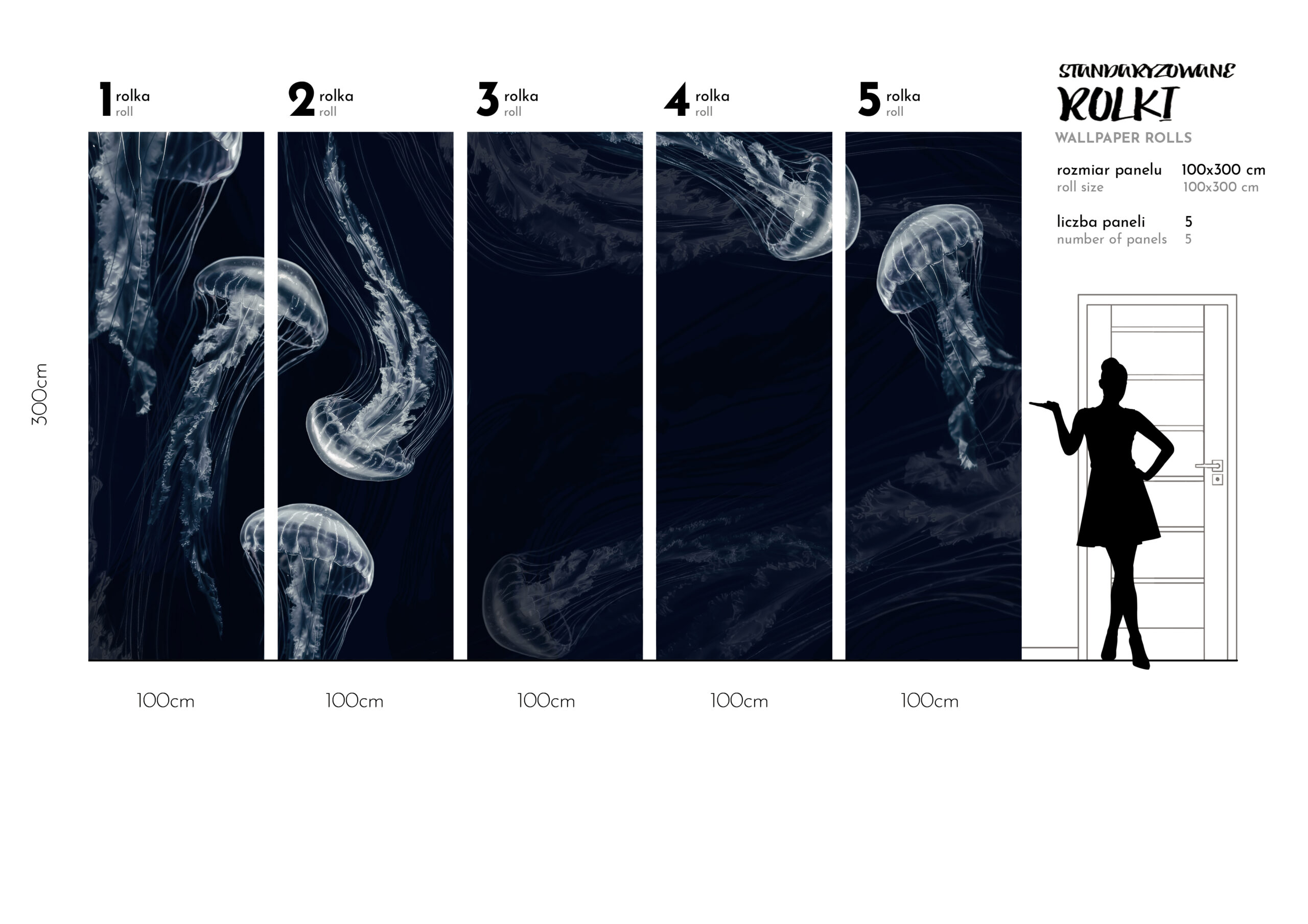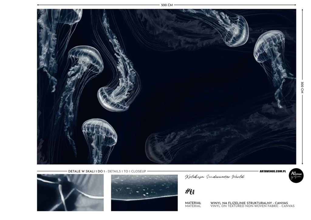 Przedstawia tańczące meduzy w granatowych głębinach oceanu. Symbolika jej ujęcia i barwy odnosi się do spokoju, harmonii i mądrości jaką reprezentuje podwodny świat. Zaprojektowana dla Twojej łazienki. Artystyczna tapeta ścienna PREMIUM z motywem graficznym – na rolki.