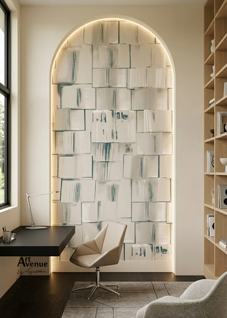- Tapeta dla moli książkowych, do biblioteki, czytelni, gabinetu, ulubionego kącika do czytania. To lekki design łączący efekt postarzenia z turkusowym kontrastem i z iluzją treści, który pięknie skomponuje się z wyraźnym kolorem. Artystyczna tapeta ścienna PREMIUM z motywem graficznym – na rolki.