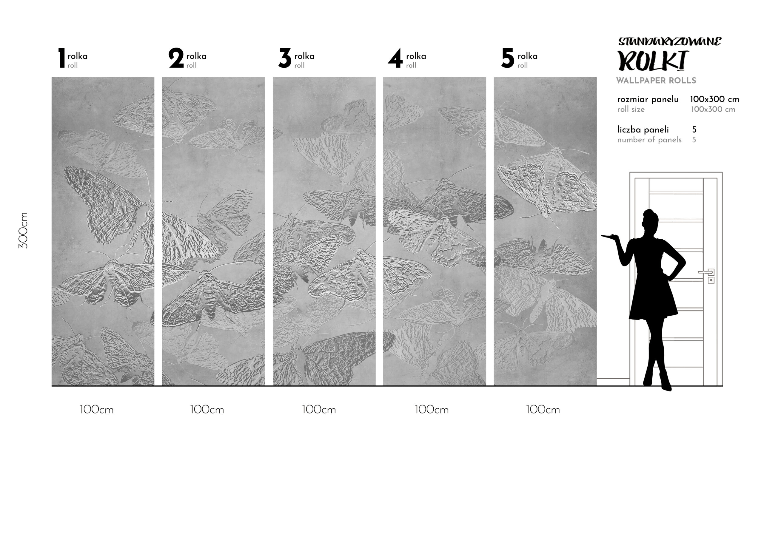 Tapeta imitująca strukturę betonu, w którym ukryto reliefy latających ciem. Ta skrzydlata kompozycja emanuje pięknem i subtelnością, a jej jasny szary kolor spełni oczekiwania designera; w stylu loft lub modern. Artystyczna tapeta ścienna PREMIUM z reliefowym wzorem – na rolki.