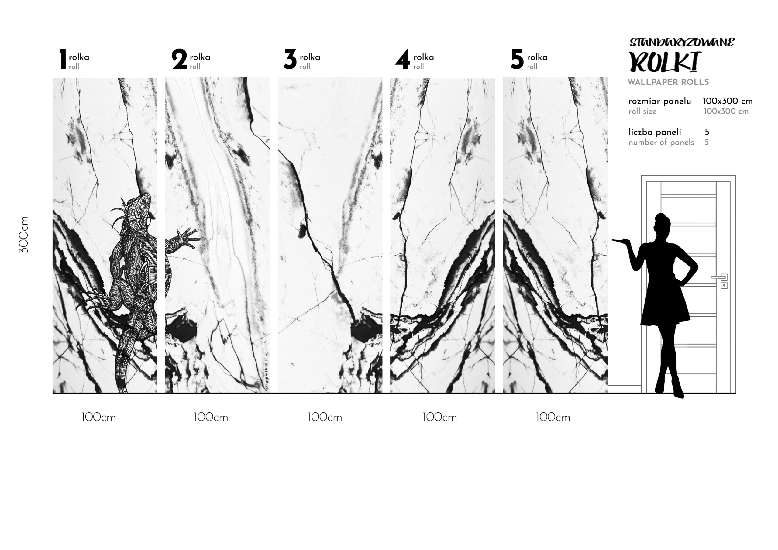 Wyjątkowy, ręcznie rysowany wzór z iguaną scalony z czarno-białą kompozycją marmuru, by zapewnić Waszym wnętrzom fuzję egzotyki i elegancji przy abstrakcyjnym ujęciu rys i pęknięć akcentujących konary drzew. Artystyczna tapeta ścienna PREMIUM z organicznie wtopionym wzorem – na rolki.