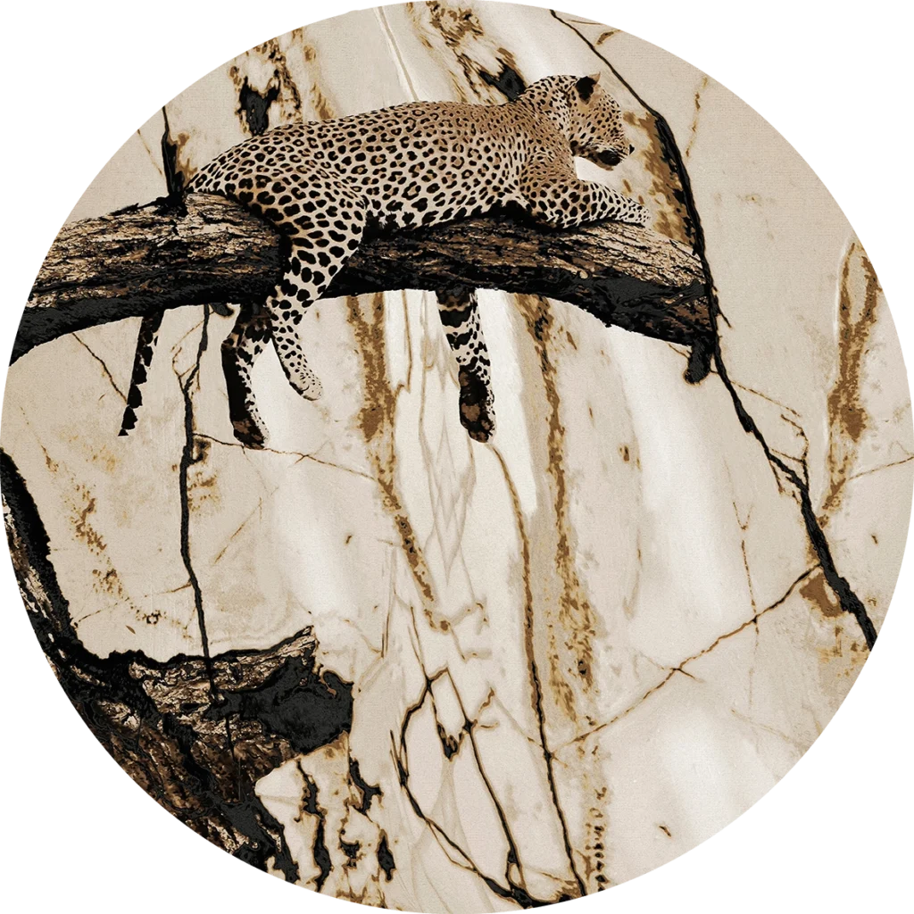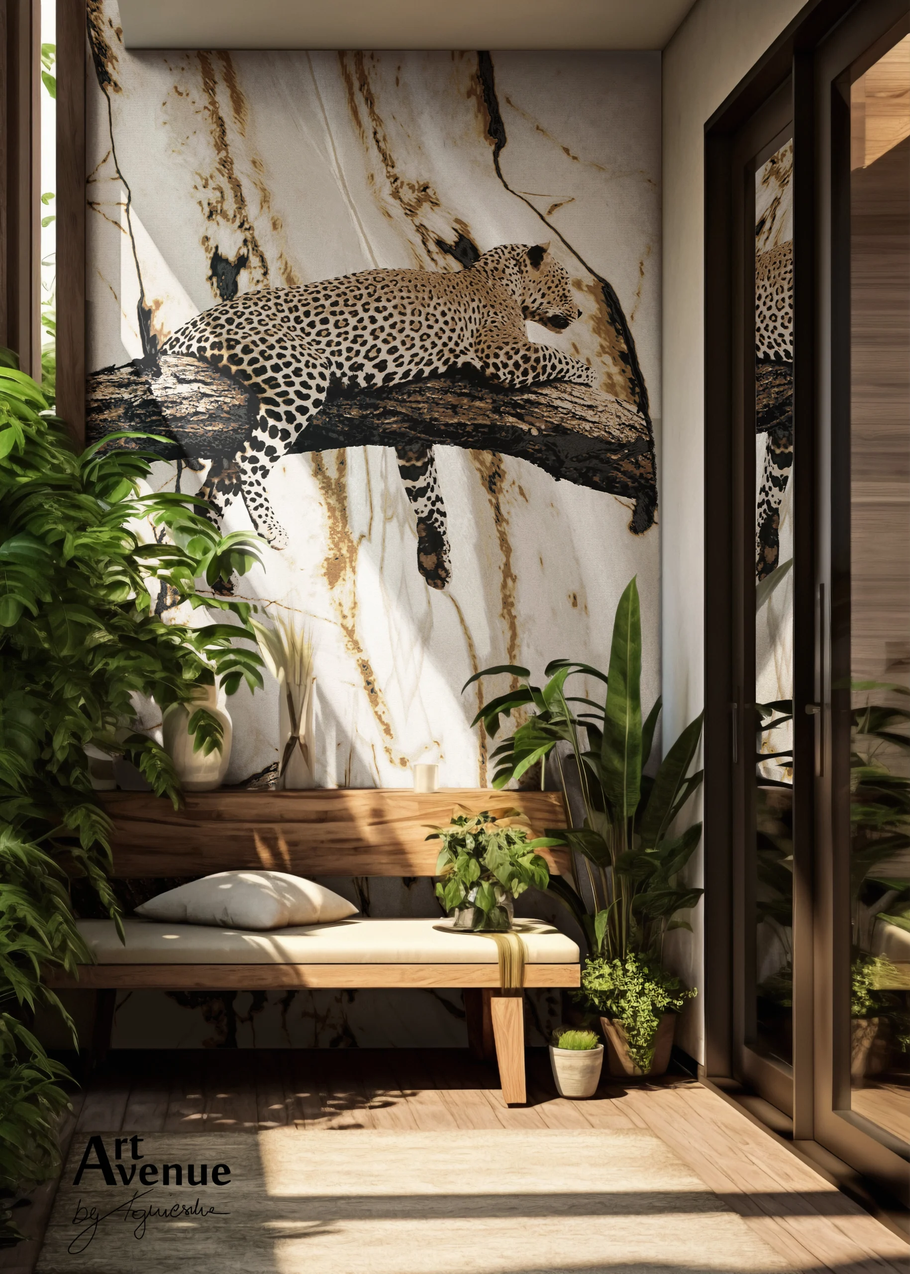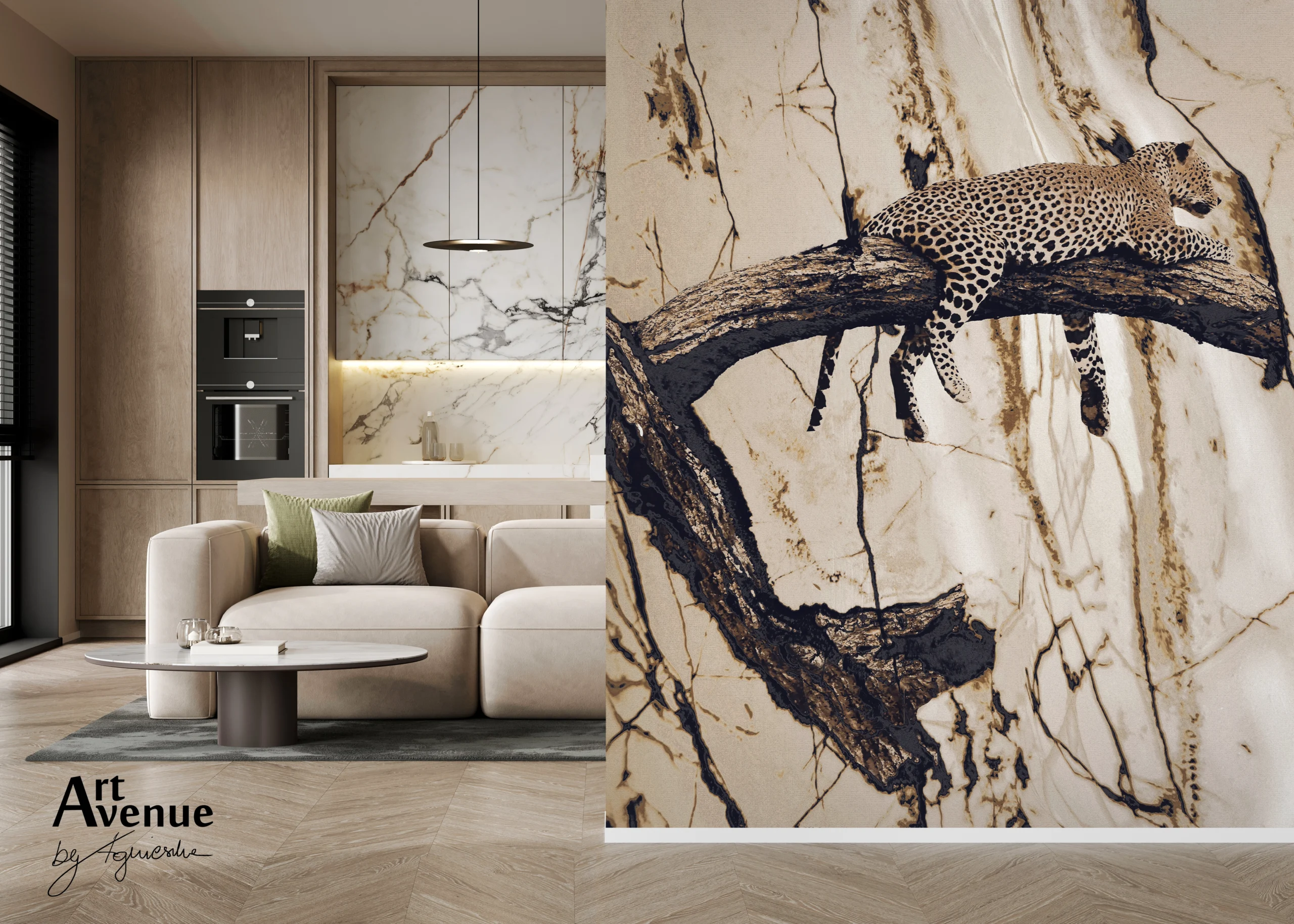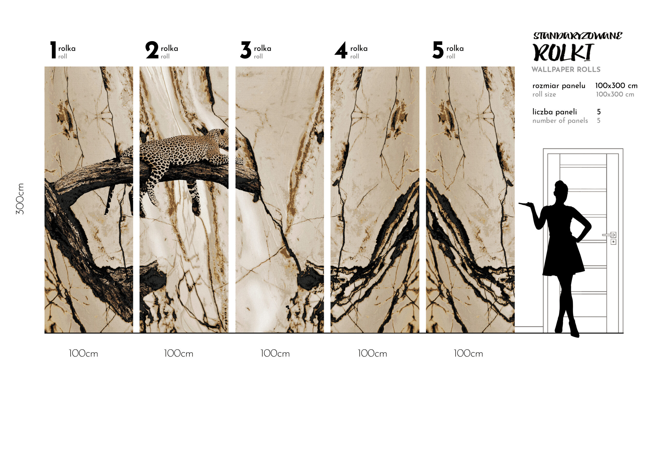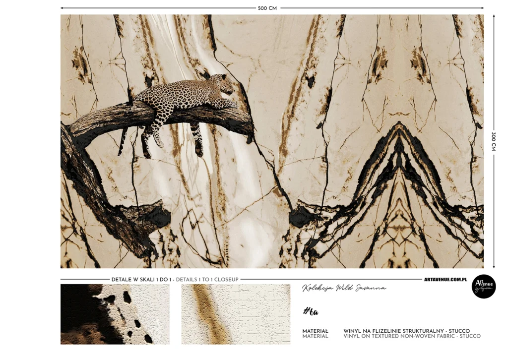 Dedykowana do ekskluzywnych wnętrz dzięki połączeniu piaskowego marmuru z brązowo-złotym i czarnym kontrastem. Zwieszony lampart to HIT w stylu Modern Safari – prezentowany nad wanną nada Twojej łazience dzikiego charakteru. Artystyczna tapeta ścienna PREMIUM z organicznie wtopionym wzorem – na rolki.