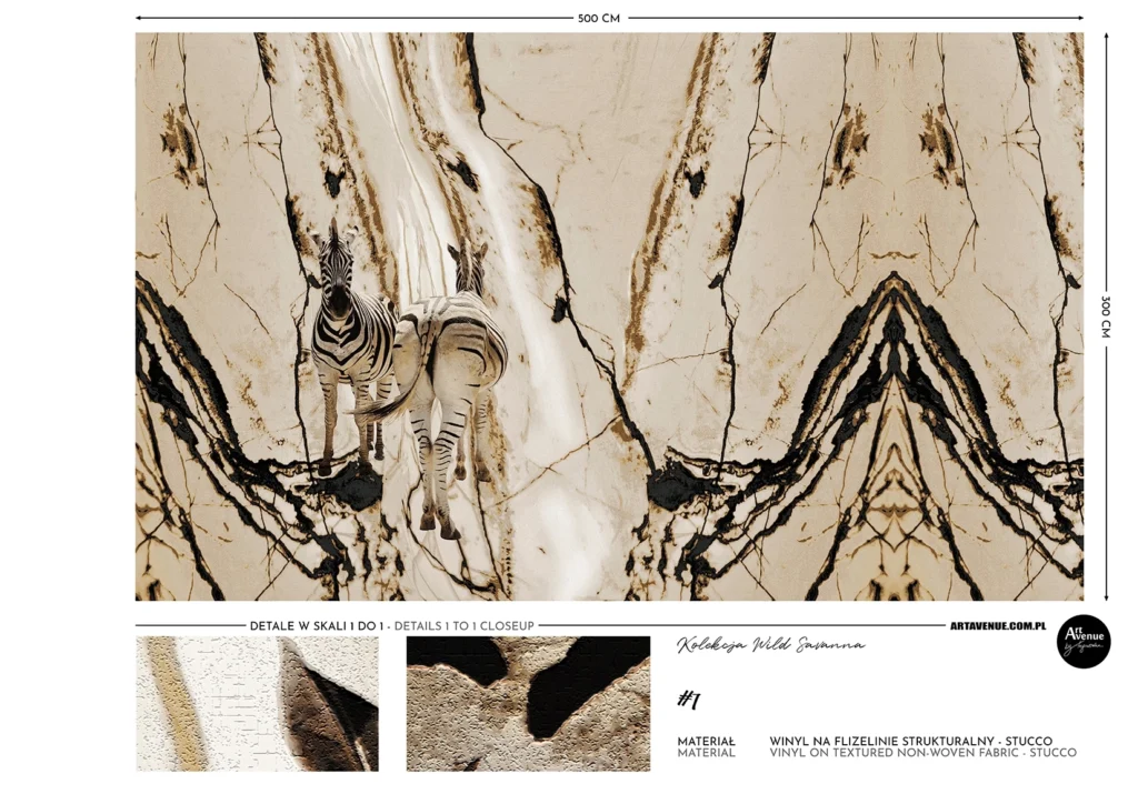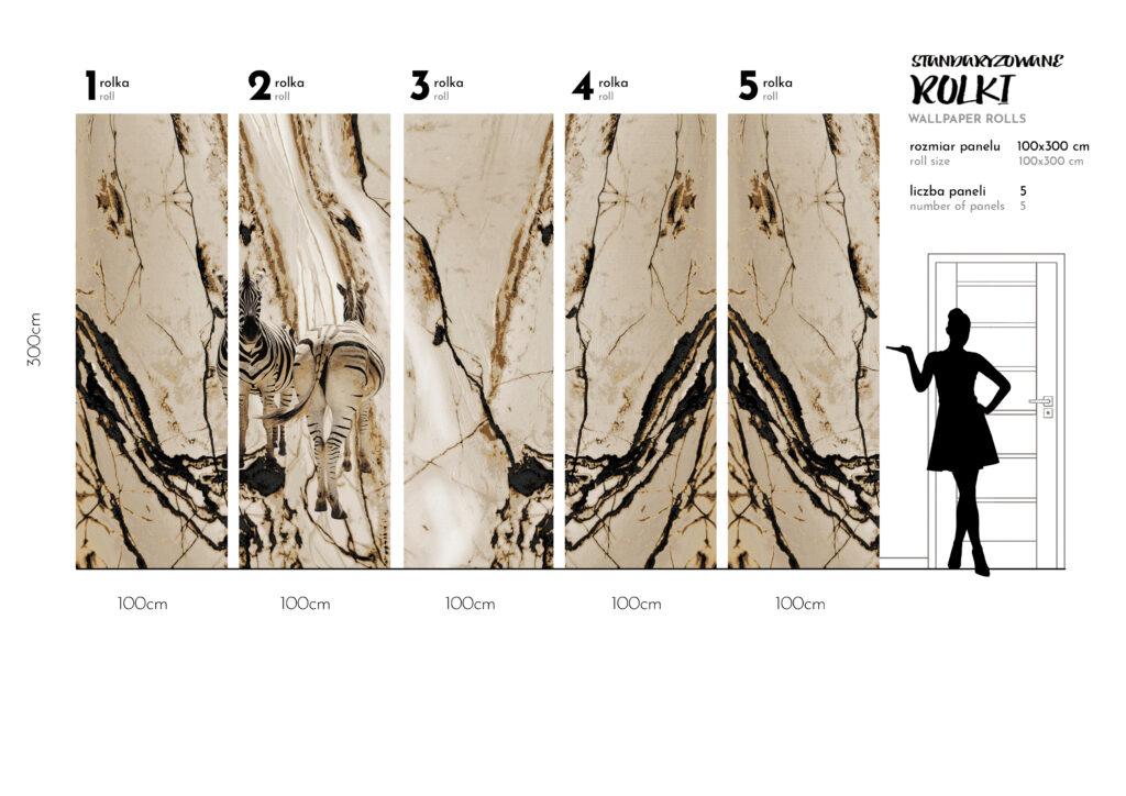 Humorystyczny motyw zebr i marmurkowego tła o jasnych, ciepłych tonach w oczywisty, ale nieprzesadzony sposób wskazuje swe przeznaczenie. Grafika pozwala na wybór również czystego marmurowego tła. Artystyczna tapeta ścienna PREMIUM z organicznie wtopionym wzorem – na rolki.