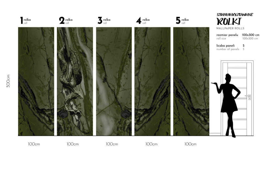Dla indywidualistów i wielbicieli węży w modnych odcieniach ciemnej zieleni i czerni. Wzór ubrany w piękne faktury i walory skóry zjawiskowego węża wzbudza dozę tajemniczości. Artystyczna tapeta ścienna PREMIUM z organicznie wtopionym wzorem – na rolki.