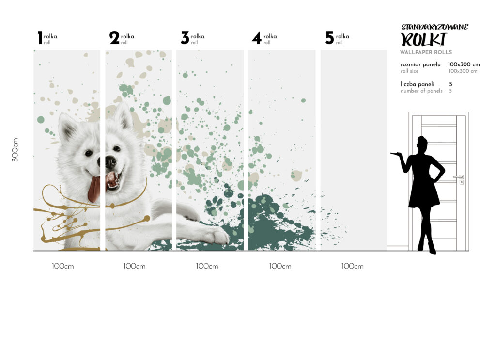 To urocza propozycja do pokoju dziecka z wizerunkiem psa rasy Samojed – uśmiechniętego psa północy. Rysunek o wysokiej precyzji wykonany w technice digital painting pozwala na wydruk postaci w dużej skali. Artystyczna tapeta ścienna PREMIUM z motywem graficznym – na rolki.
