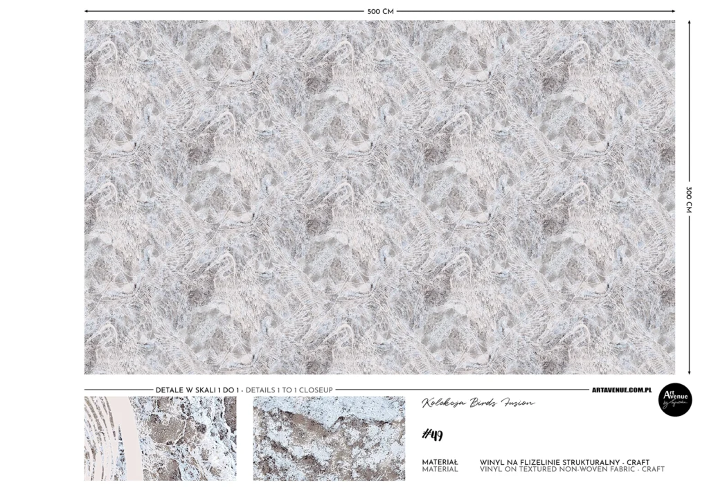 Przedstawia przepiękny ptasi wzór linearny powstały z ich białych grafik – sylwetek subtelnie przebijających się z melanżu fioletowo szarych i niebieskich faktur. Art’owy design ściany pasujący do różnych pomieszczeń. Artystyczna tapeta ścienna PREMIUM z motywem ornitologicznym – na wymiar.