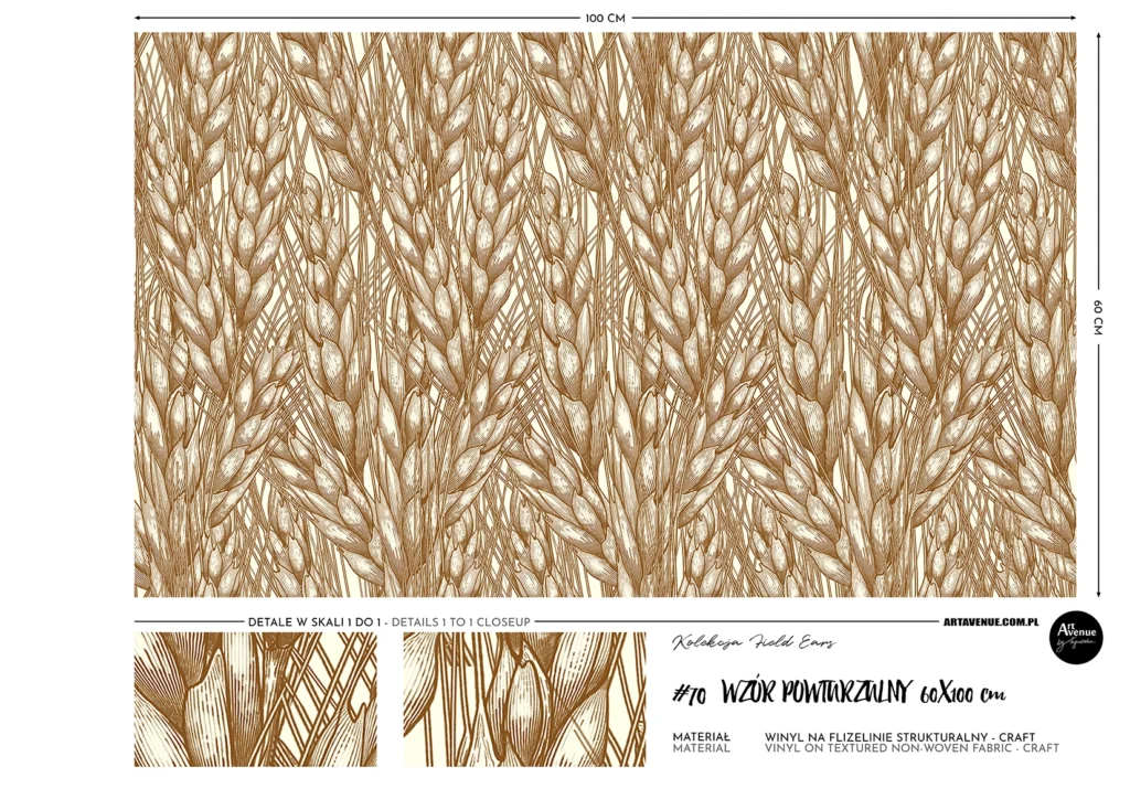 Kontynuacja sielskiego wzoru kłosów użytego do zbudowania skomplikowanego projektu ogromnej liczby realistycznie ułożonych elementów w perspektywie. Panele posiadają wzór powtarzalny. Artystyczna tapeta ścienna PREMIUM z motywem graficznym – na wymiar.
