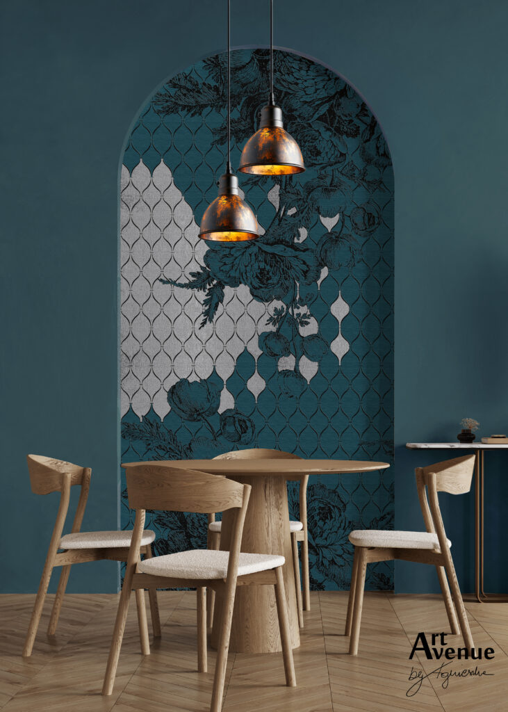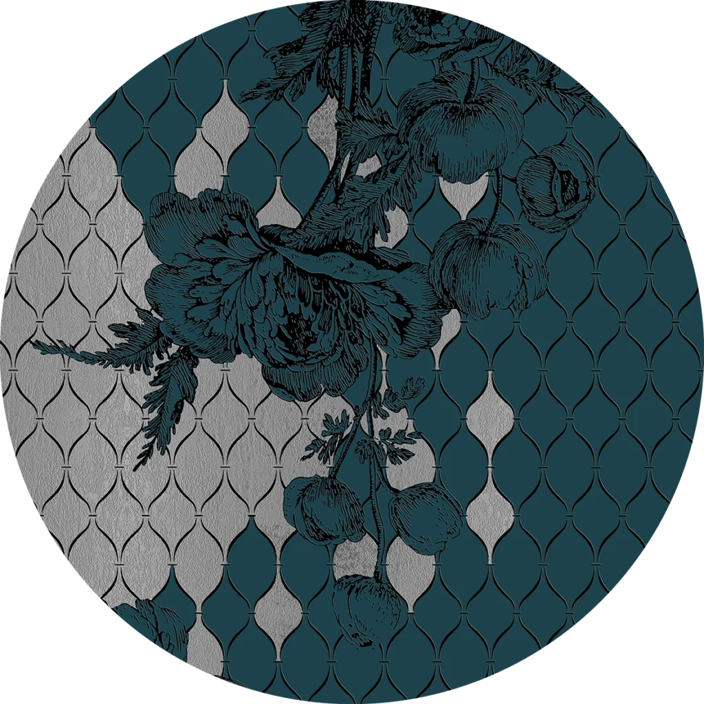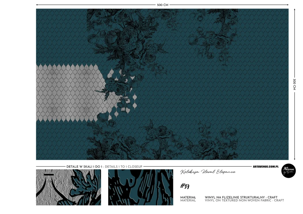 Eleganckie połączenie kwiatowej grafiki z ciekawą mozaiką na tle ciemnego turkusu z miejscowo dodanym efektem imitującym srebro. Stanowi wyjątkowe zestawienie kilku trendów z pięknym wzorem. Artystyczna tapeta ścienna PREMIUM z motywem graficznym – na wymiar.