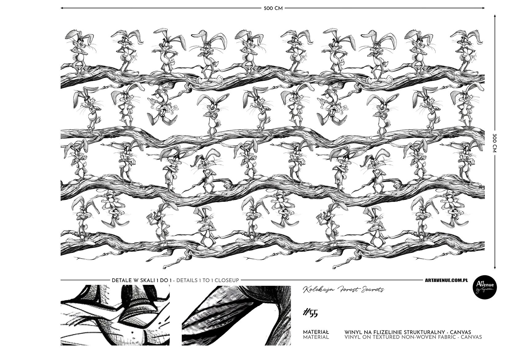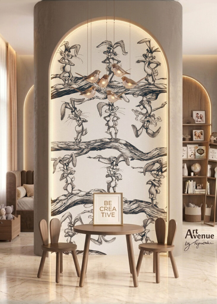 Dowcipna i dynamiczna propozycja, idealna do pokoju dziecka. Przedstawia charakterne, rysunkowe króliki balansujące na gałęziach co wprowadza do wnętrza energię i bajkową atmosferę. Pobudza wyobraźnię i bawi detalem. Artystyczna tapeta ścienna PREMIUM z motywem graficznym – na wymiar.