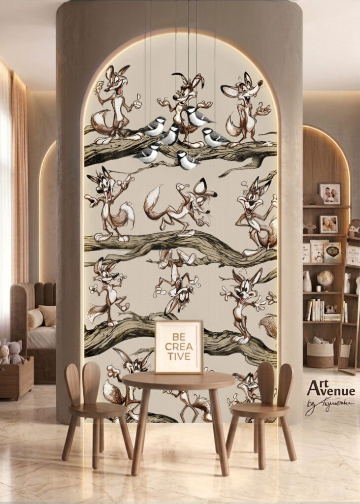 Kolorowa interpretacja wzoru z lisami. Te ilustracyjne postacie zyskały nową energię dzięki ziemistym akcentom. Rude i zielonkawe tony wprowadzają ciepło do dziecięcego wnętrza. Humorystyczny detal, pogodny, bajkowy klimat. Artystyczna tapeta ścienna PREMIUM z motywem graficznym – na wymiar.