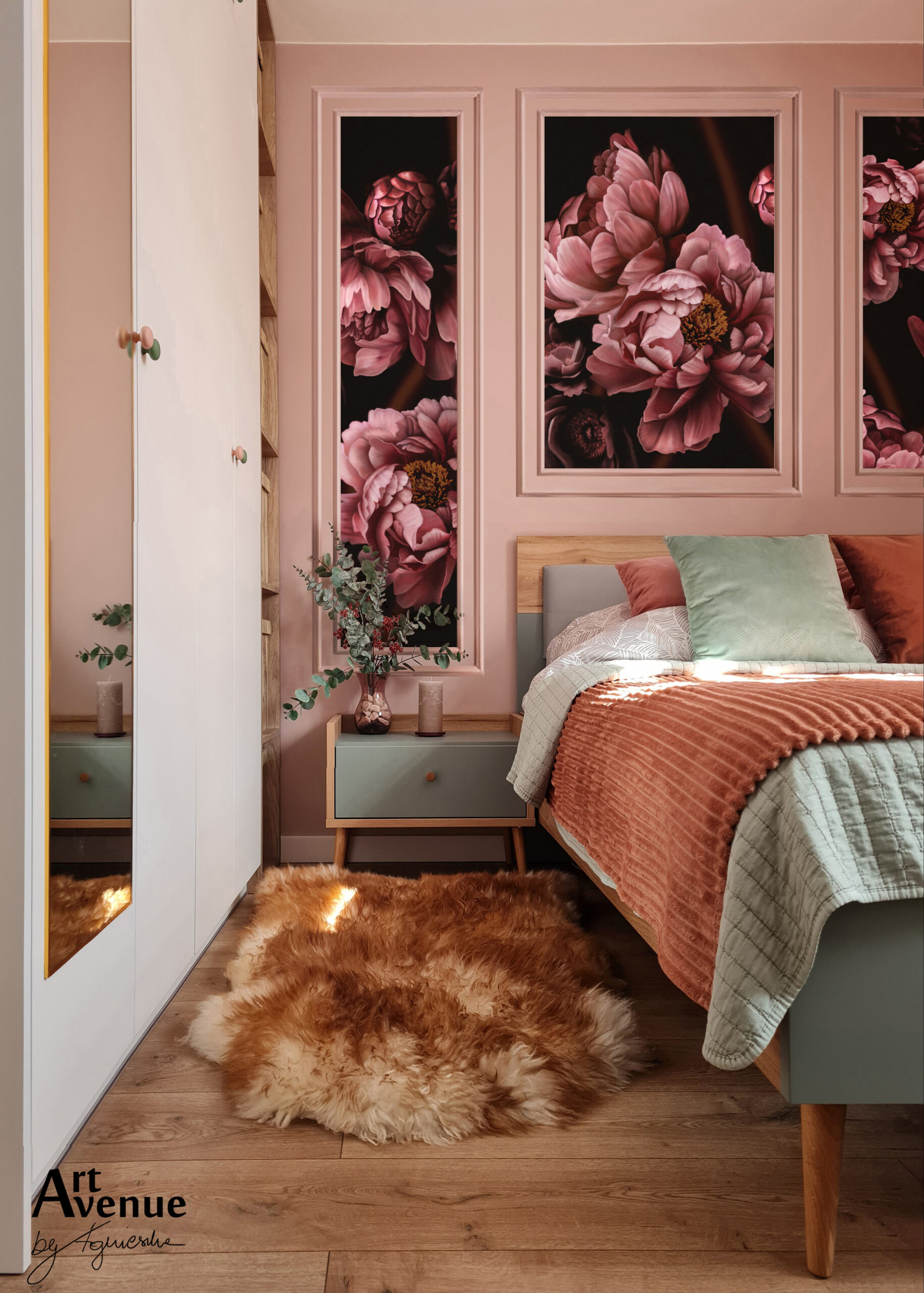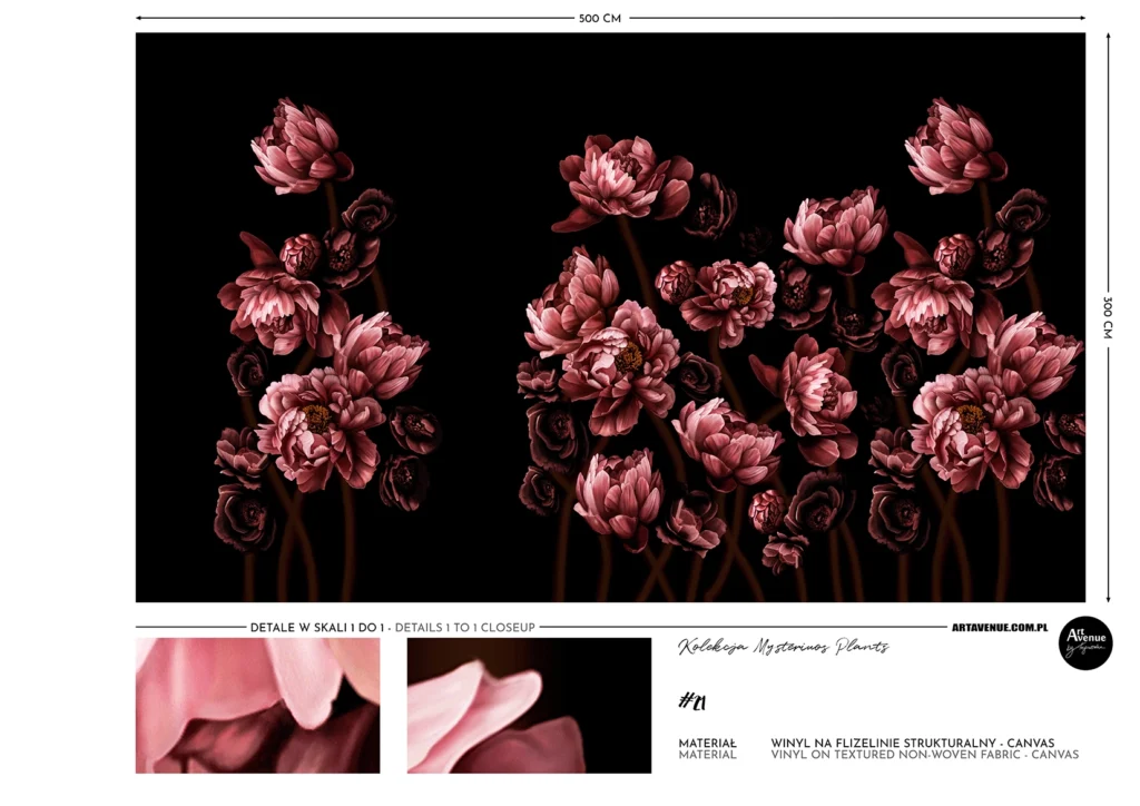 Tapeta z kobiecym kwiatowym wzorem jest pełna barw i kontrastu. Jeśli róż to Twój kolor, te piękne, malowane peonie zawrócą Ci w głowie. Poszczególne panele/rolki zaprojektowane są tak, aby móc wybrać najlepszy dla wnętrza fragment. Artystyczna tapeta ścienna PREMIUM z motywem kwiatowym – na wymiar.