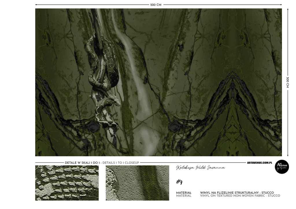 Dla indywidualistów i wielbicieli węży w modnych odcieniach ciemnej zieleni i czerni. Wzór ubrany w piękne faktury i walory skóry zjawiskowego węża wzbudza dozę tajemniczości. Artystyczna tapeta ścienna PREMIUM z organicznie wtopiony, wzorem – na wymiar.