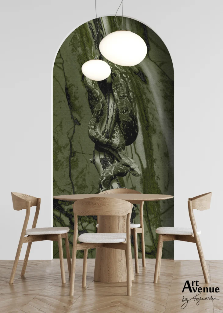 Dla indywidualistów i wielbicieli węży w modnych odcieniach ciemnej zieleni i czerni. Wzór ubrany w piękne faktury i walory skóry zjawiskowego węża wzbudza dozę tajemniczości. Artystyczna tapeta ścienna PREMIUM z organicznie wtopiony, wzorem – na wymiar.