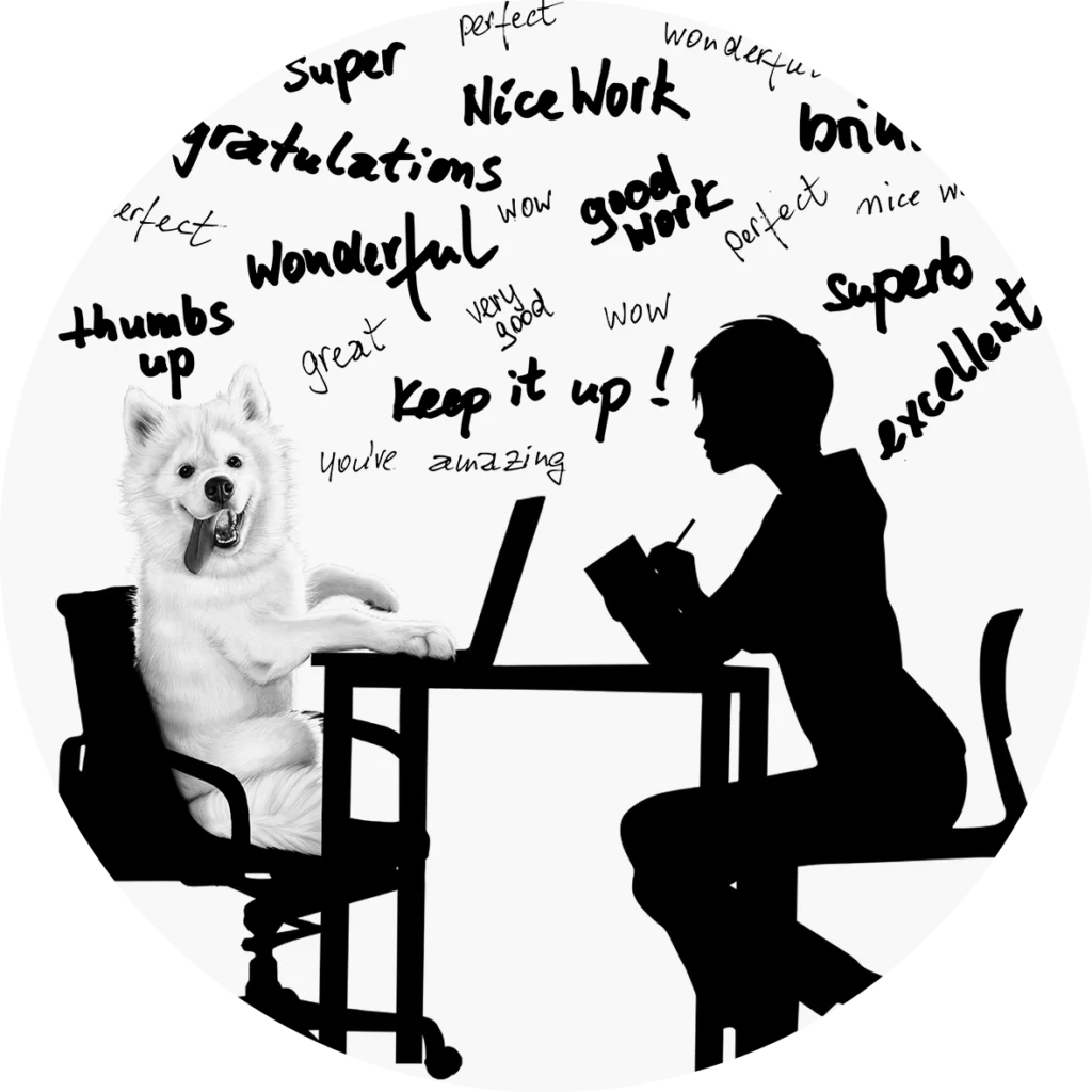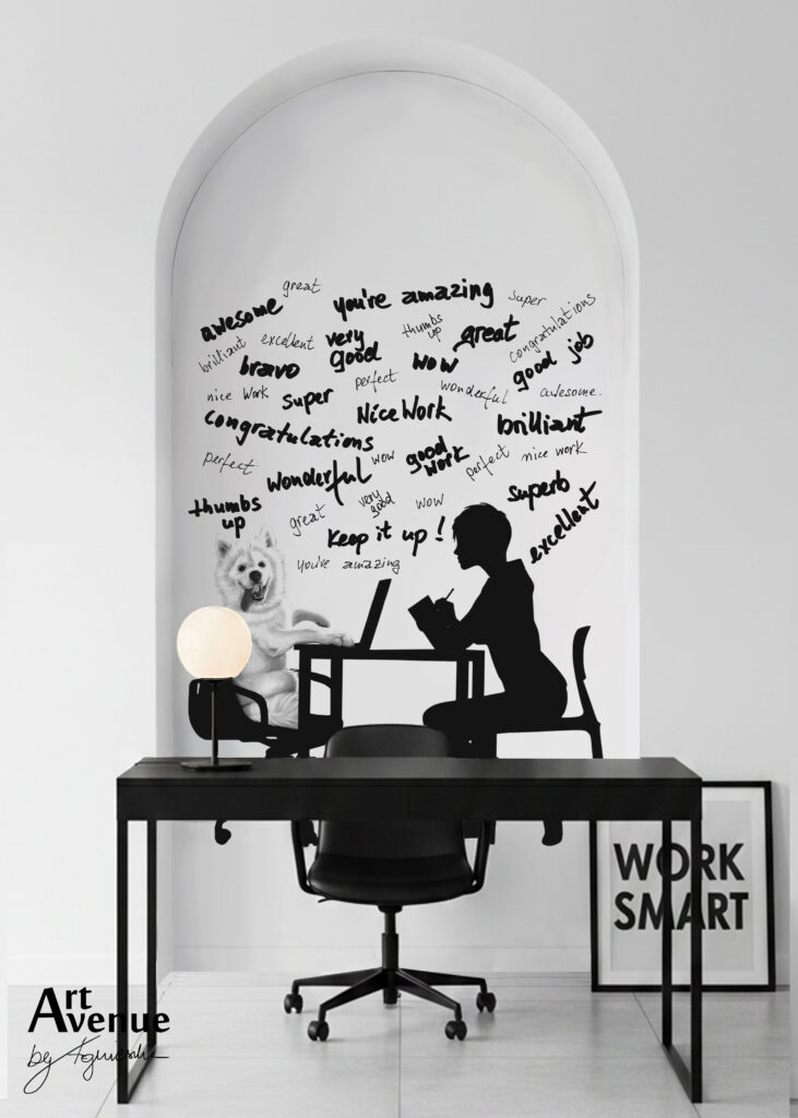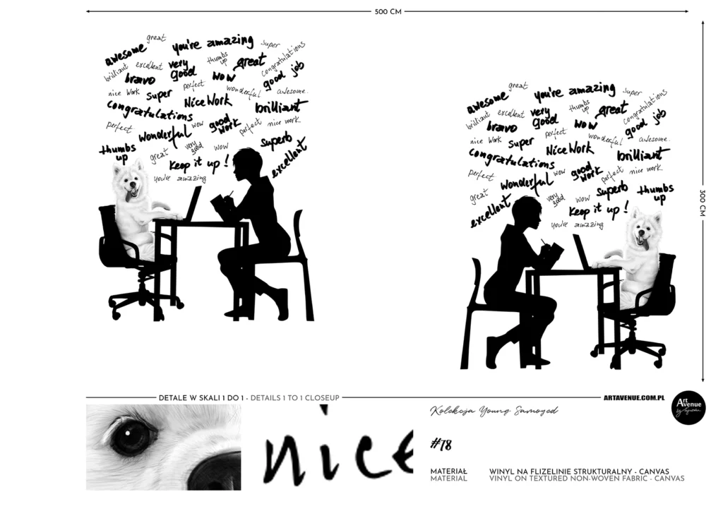 Motywacyjny projekt grafiki z antydepresyjnym wizerunkiem psa oraz licznymi afirmacjami dedykowany do biura, gabinetu lub pokoju nastolatka. Oprawa w stylu black&white dodaje powagi i elegancji. Artystyczna tapeta ścienna PREMIUM z motywem graficznym – na wymiar.