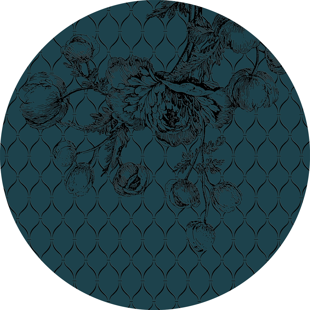 Piękne połączenie mozaiki z grafiką i modnym kolorem ciemnego turkusu. Wzór pozwala wyeksponować dominantę i/lub wybrać bardziej umiarkowane co do wzoru partie. Artystyczna tapeta ścienna PREMIUM z motywem graficznym do zastosowania na ścianie, kaflach, meblach – w kształcie koła o średnicy 120 cm.