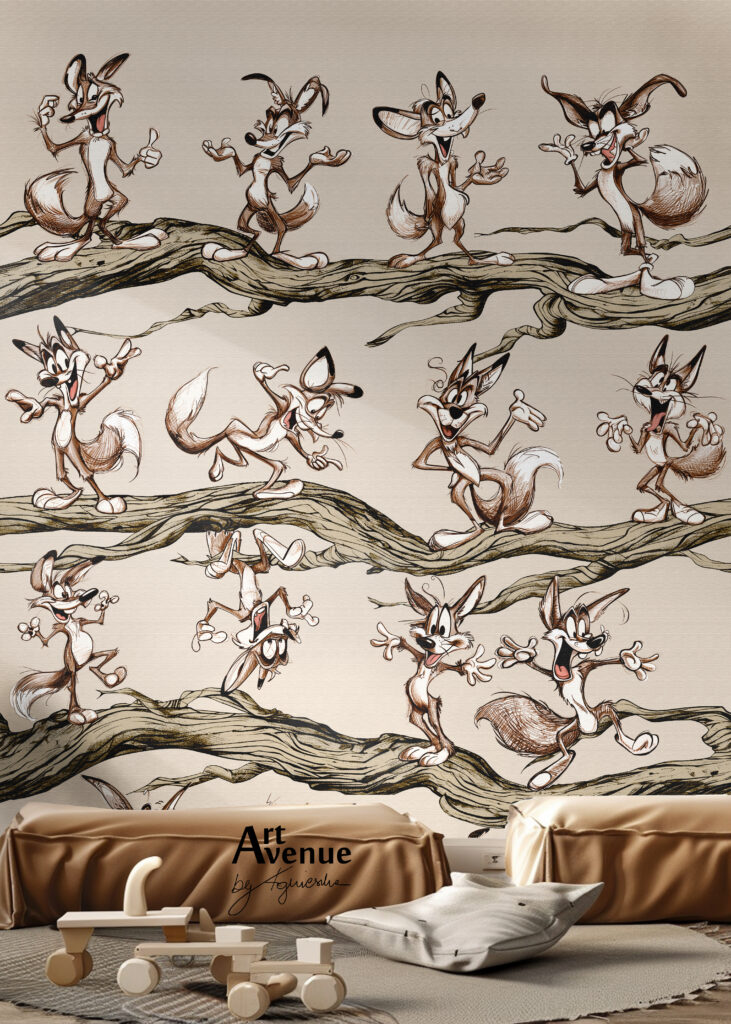 Kolorowa interpretacja wzoru z lisami. Te ilustracyjne postacie zyskały nową energię dzięki ziemistym akcentom. Rude i zielonkawe tony wprowadzają ciepło do dziecięcego wnętrza. Humorystyczny detal, pogodny, bajkowy klimat. Artystyczna tapeta ścienna PREMIUM z motywem graficznym do zastosowania na ścianie, kaflach, meblach – w kształcie koła o średnicy 120 cm.