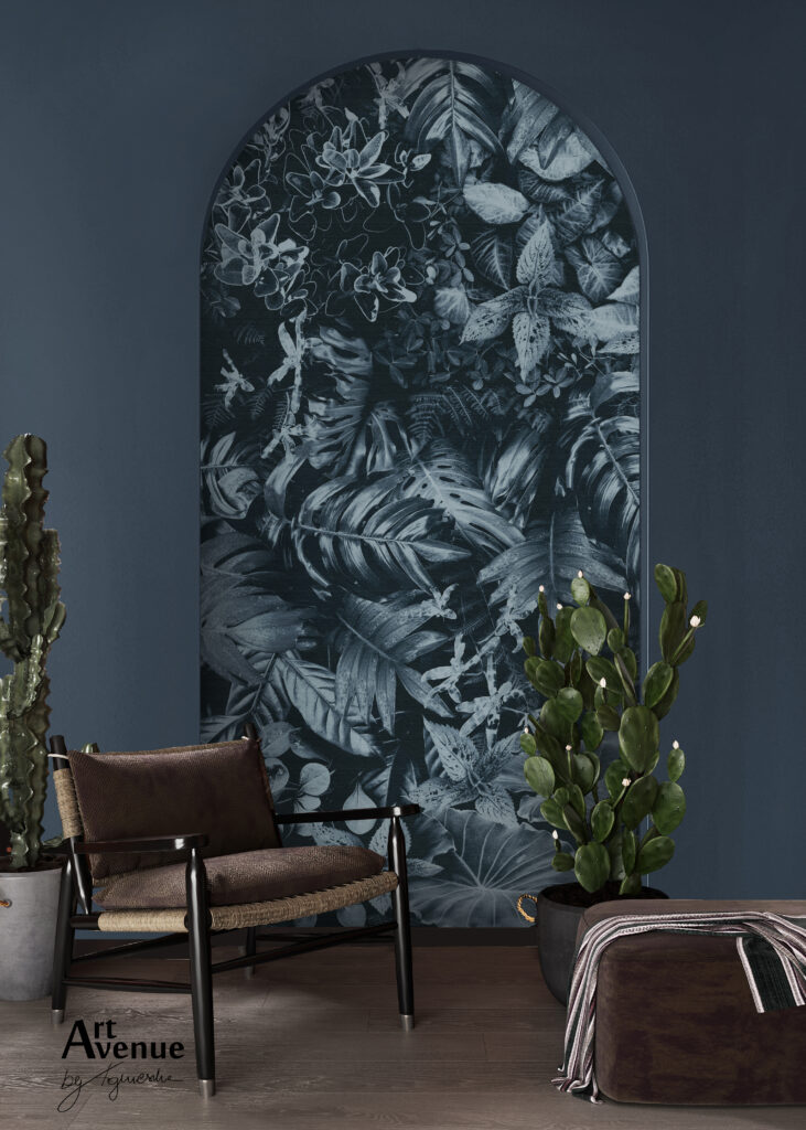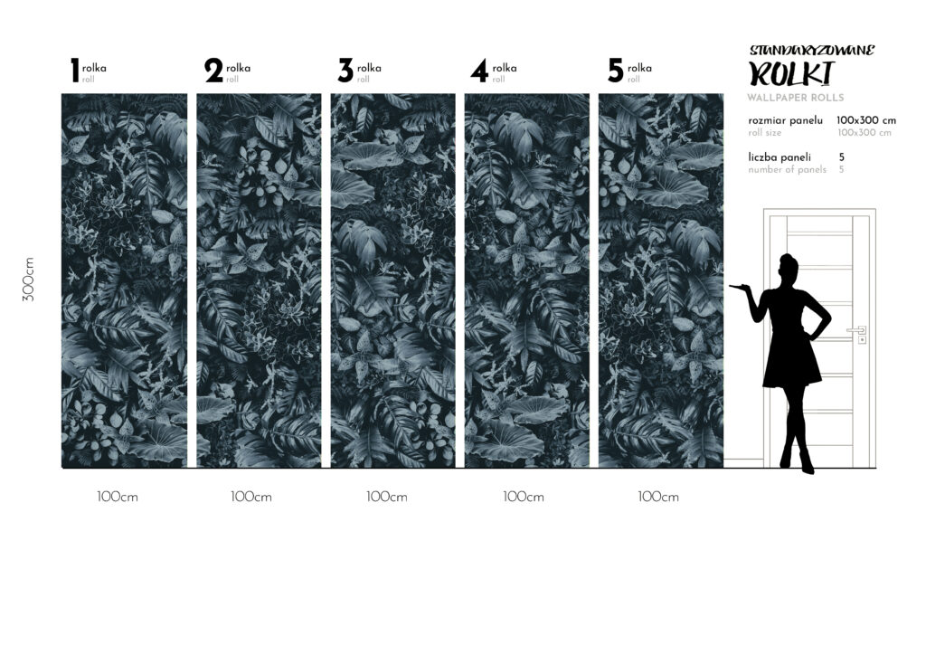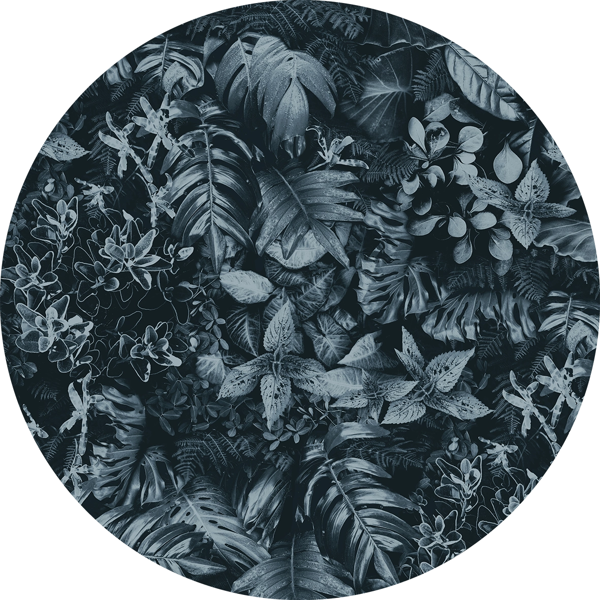Przedstawia monokolorową szatę roślinną w eleganckim granatowym kolorze, która powstała z myślą o tworzeniu niesamowitych połączeń gładkich powierzchni urozmaiconych. Artystyczna tapeta ścienna PREMIUM z motywem graficznym do zastosowania na ścianie, kaflach, meblach – w kształcie koła o średnicy 120 cm.