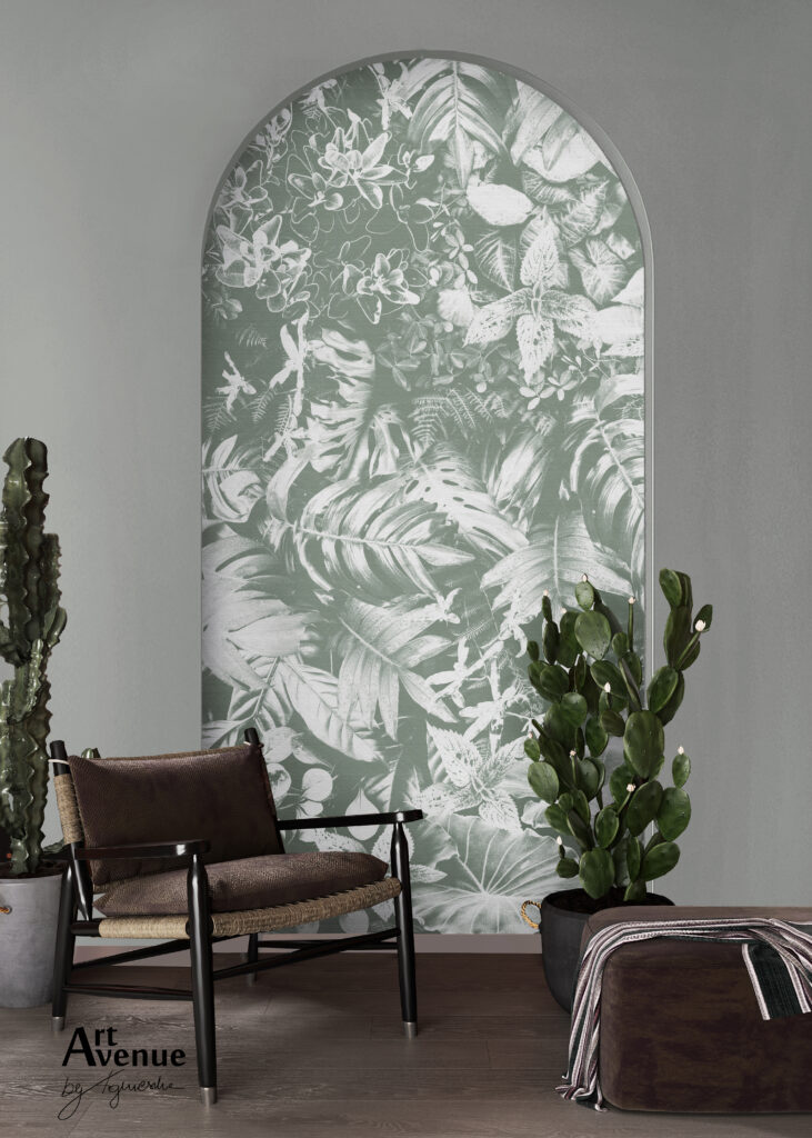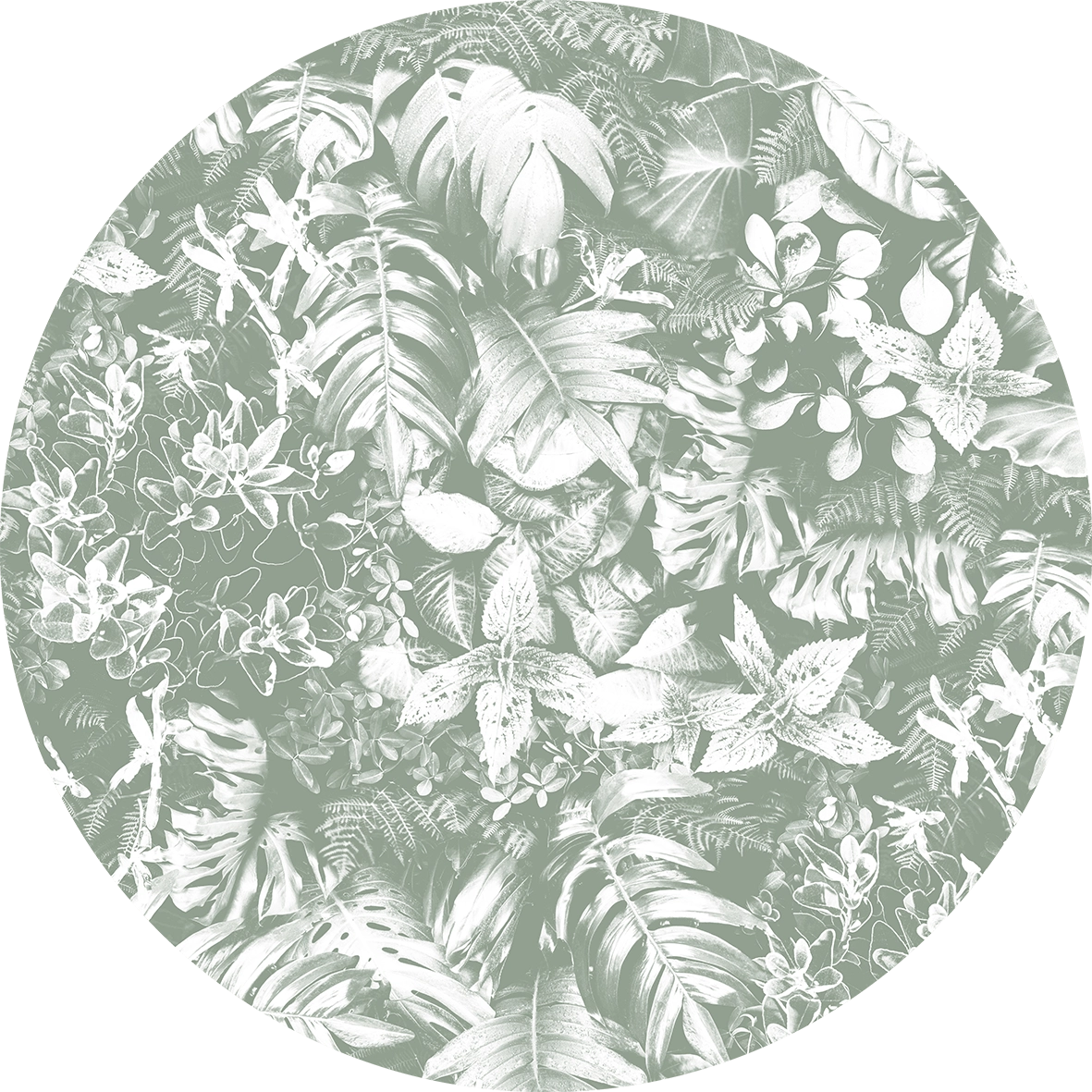 Przedstawia blado miętowy chic wraz z białym, rajskim wzorem. Roślinna kombinacja dynamizująca i orzeźwiająca wnętrze; świadomie odchodzi od klasyki wnętrzarskiej w celu zaspokojenia różnych potrzeb projektowych. Artystyczna tapeta ścienna PREMIUM z motywem graficznym do zastosowania na ścianie, kaflach, meblach – w kształcie koła o średnicy 120 cm.