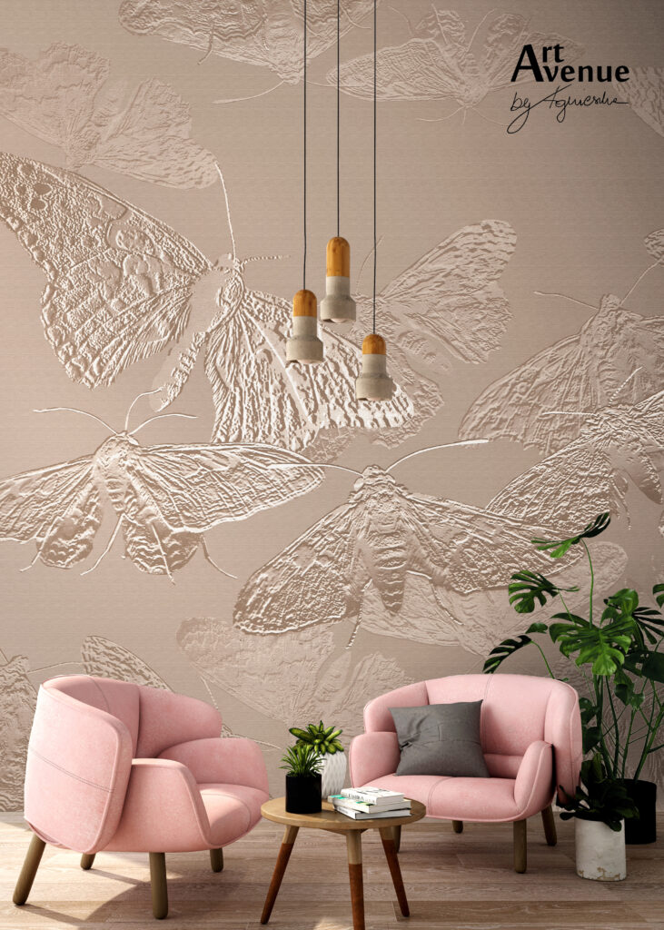 To monochromatyczna propozycja wibrujących ciem zatopionych w kolorze taupe. Prezentowana grafika odnosi się do naszej podświadomości, która poszukuje światła. Jej odcień jest równie elegancki co ponadczasowy. Artystyczna tapeta ścienna PREMIUM z reliefowym wzorem do zastosowania na ścianie, kaflach, meblach – w kształcie koła o średnicy 120 cm.