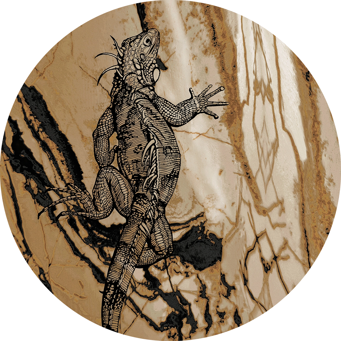 Wyjątkowy, ręcznie rysowany wzór z iguaną w gorącym klimacie sawanny na tle piaskowo-złocistego marmuru. Uatrakcyjni i ociepli wnętrze dodając mu szyku. Artystyczna tapeta ścienna PREMIUM z organicznym wzorem do zastosowania na ścianie, kaflach, meblach – w kształcie koła o średnicy 120 cm.