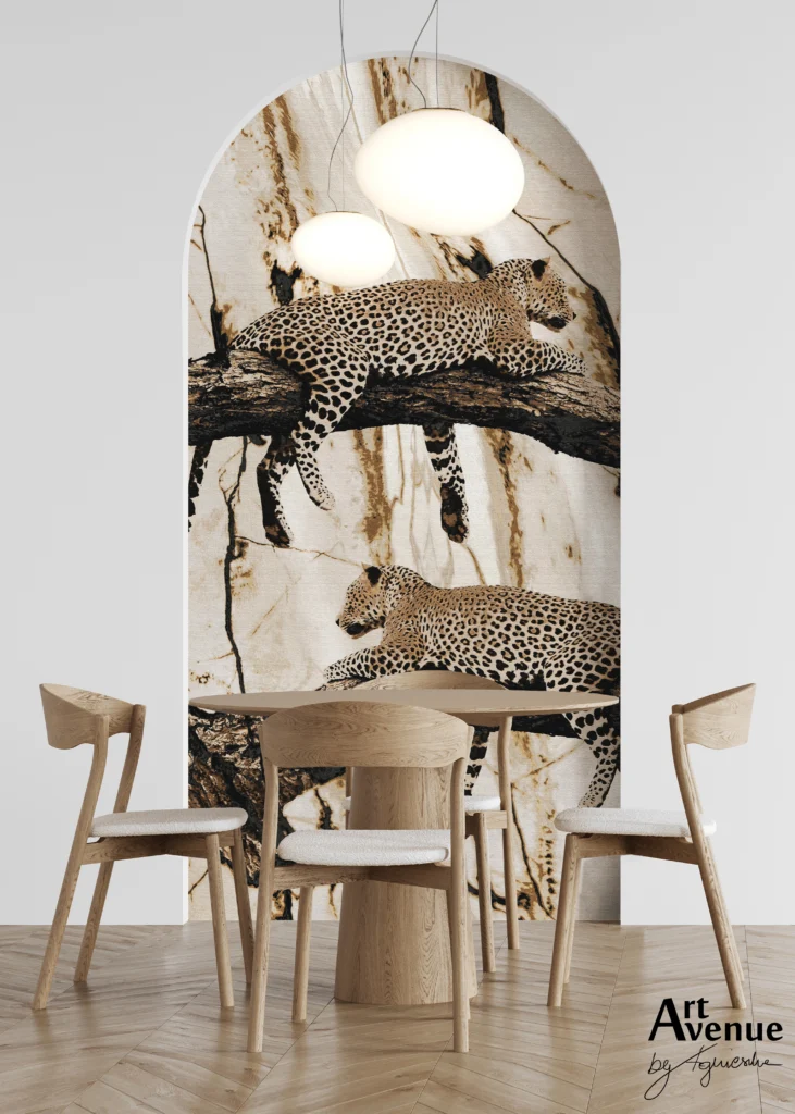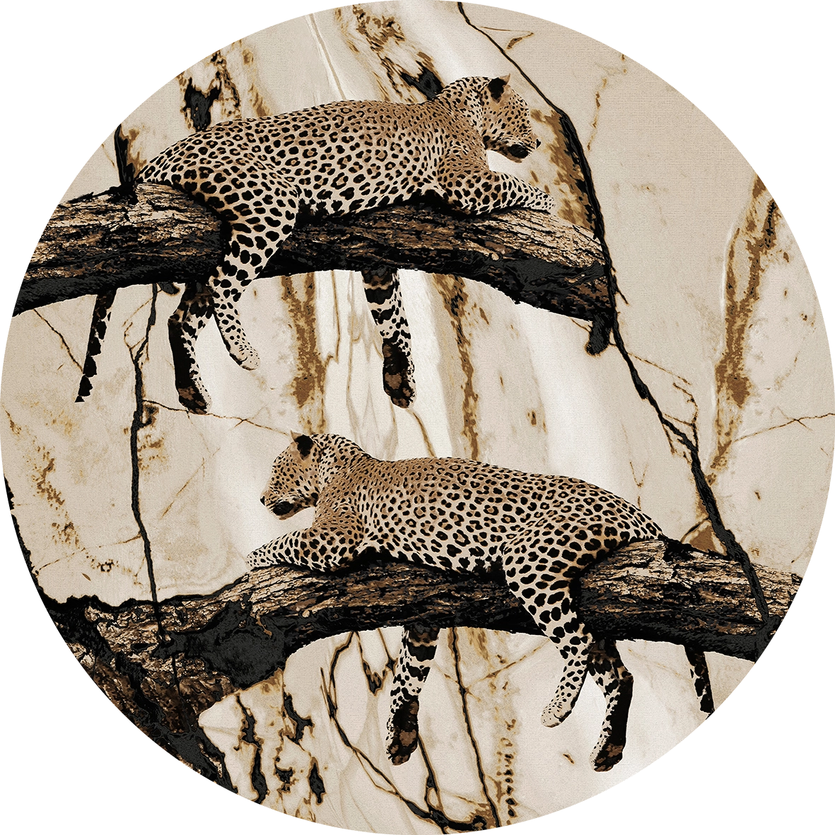 Dedykowana do ekskluzywnych wnętrz dzięki połączeniu piaskowego marmuru z brązowo-złotym i czarnym kontrastem. Zwieszony lampart to HIT – prezentowany nad wanną nada Twojej łazience dzikiego charakteru. Artystyczna tapeta ścienna PREMIUM z organicznym wzorem do zastosowania na ścianie, kaflach, meblach – w kształcie koła o średnicy 120 cm.