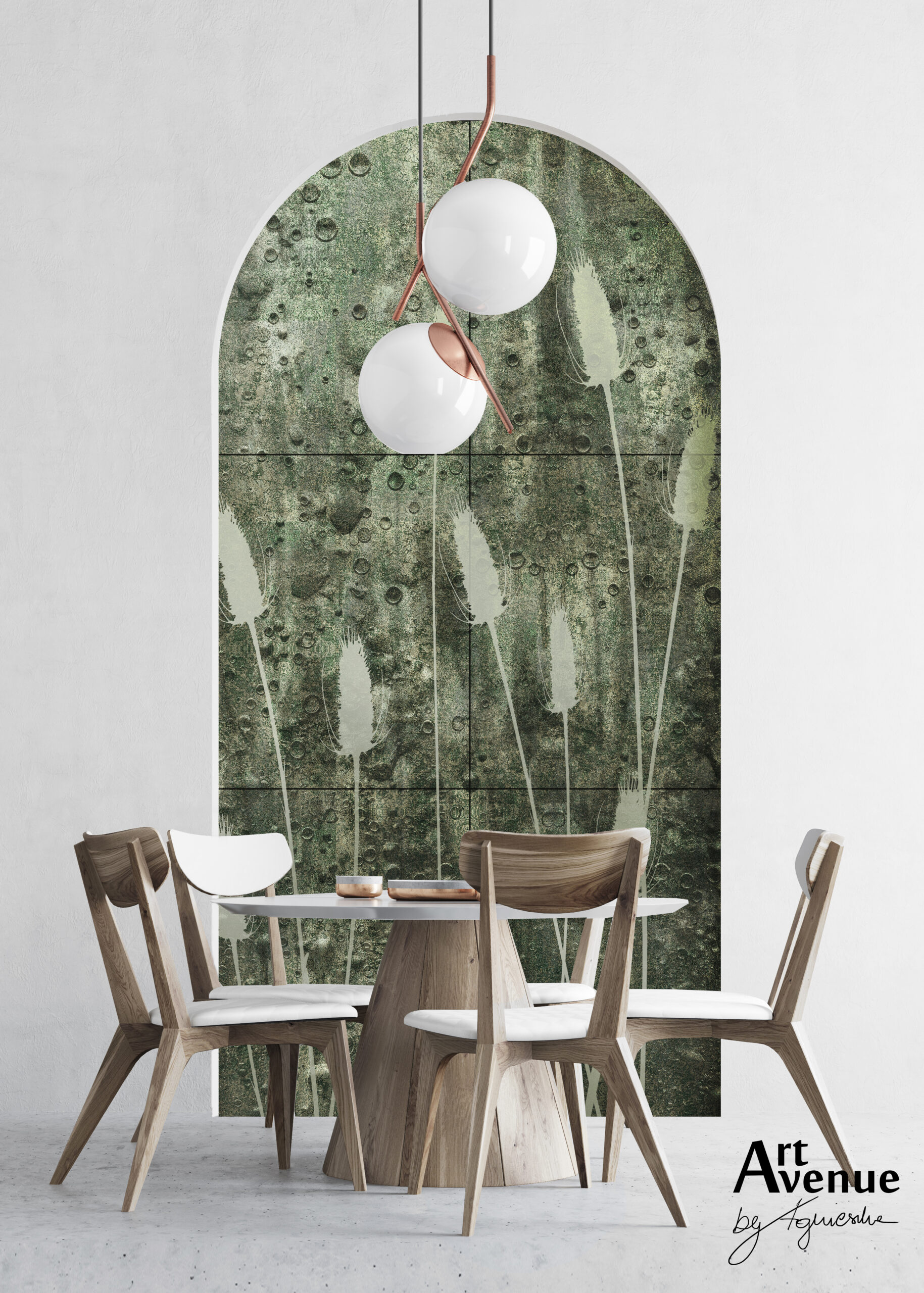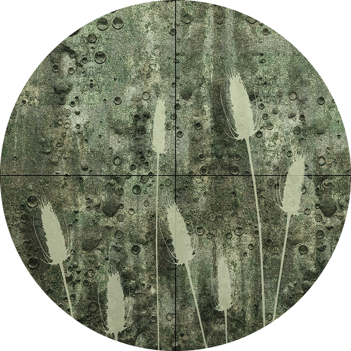 To tapeta z motywem roślinnym na tle metrowych, kwadratowych kafli w odcieniach metalicznej, stłumionej zieleni. Druk z reliefowym efektem okrągłych odkształceń, z daleka wyglądających jak bańki lub krople wody. Artystyczna tapeta ścienna PREMIUM z motywem botanicznym do zastosowania na ścianie, kaflach, meblach – w kształcie łuku o wymiarach 240×120 cm.