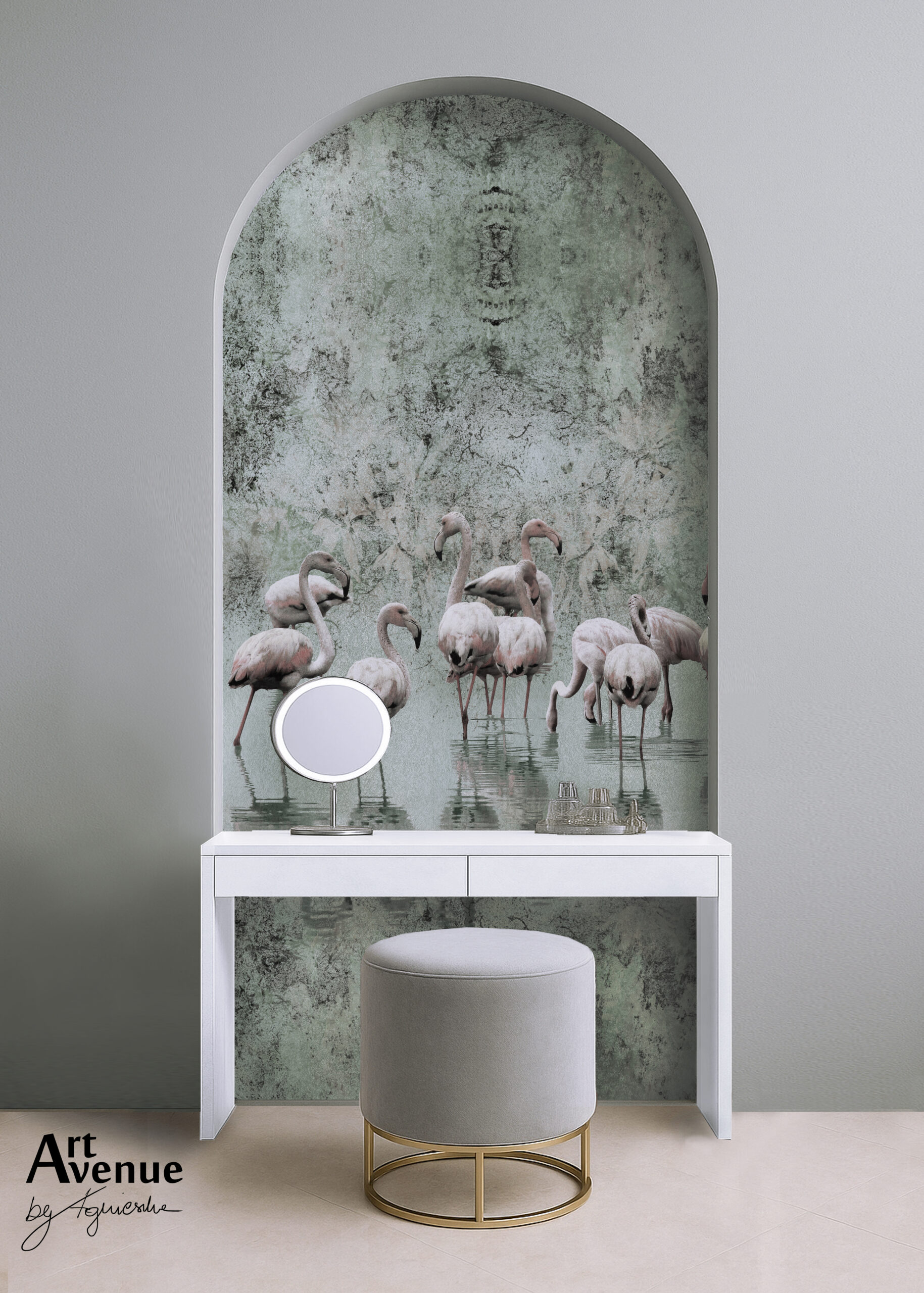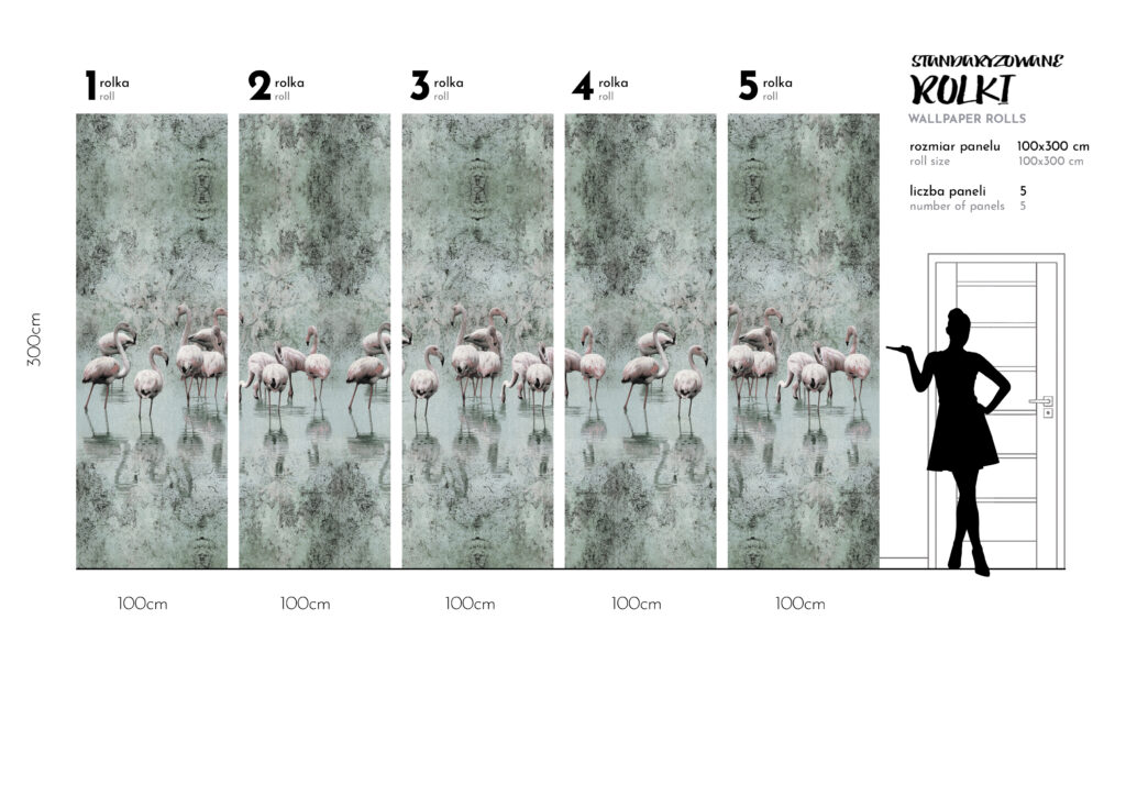 Ta tapeta pozwoli Ci oryginalnie zaaranżować ścianę, na której skupisz wzrok na długie godziny. Wzór o jasnej, pudrowej kolorystyce w odcieniach mięty i delikatnego różu, z motywem pięknych blado różowych flamingów. Piękne fakturowanie w grafice podbite teksturą materiału. Artystyczna tapeta ścienna PREMIUM z motywem graficznym do zastosowania na ścianie, kaflach, meblach – w kształcie łuku o wymiarach 240×120 cm.