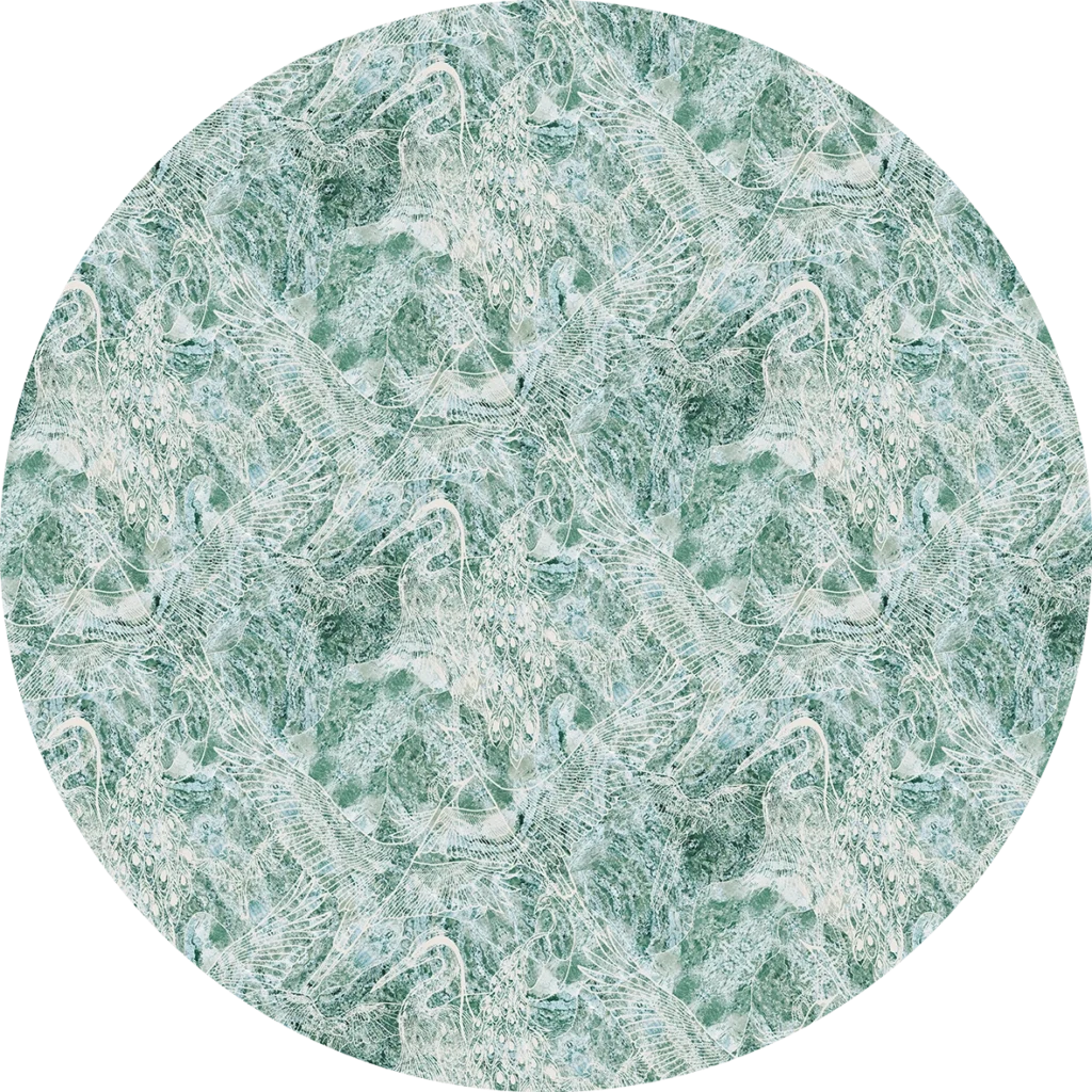 Propozycja zielono niebieskiego melanżu tekstur o zagęszczonym białym wzorze zbudowanym linearnie na podziałach heksagonalnych. To swoista abstrakcja, z której możemy odczytać rysunki np. pięknych żurawi. Artystyczna tapeta ścienna PREMIUM z motywem graficznym do zastosowania na ścianie, kaflach, meblach – w kształcie łuku o wymiarach 240×120 cm.